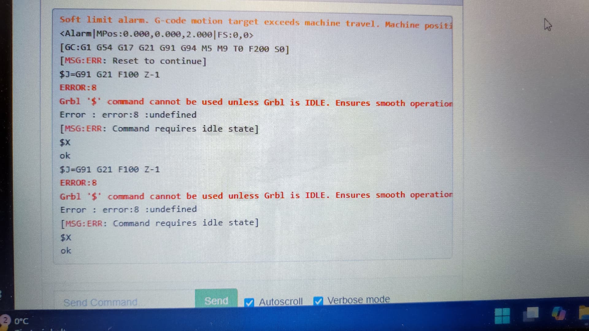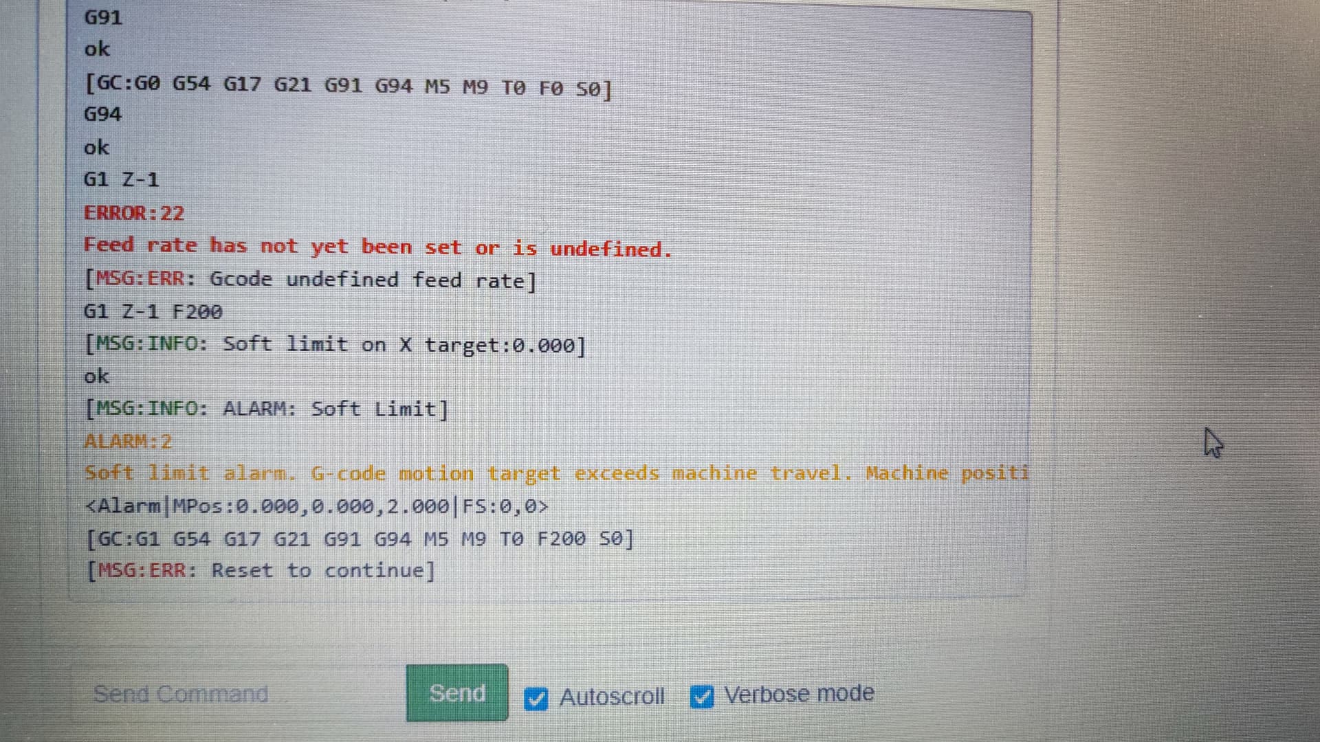 And I get a soft limit alarm. The same happens on both axes. I think I might have misconfigured something because this was working fine earlier. I’ve tried using different Z values (e.g., -50), but I keep getting the soft limit alarm. However, I can still move the machine using the web UI (after reboot the jackpot), but these G-codes don’t work.
