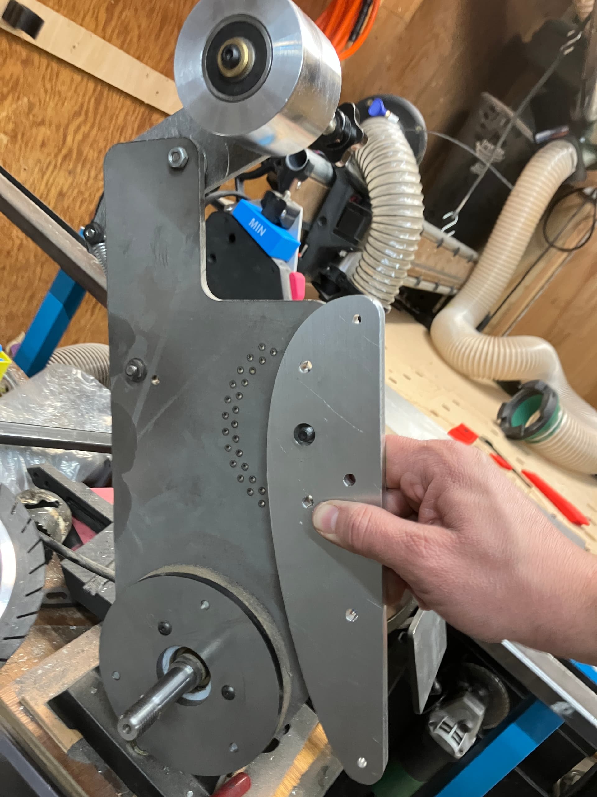 About 2 years ago I designed a belt grinder attachment for my bench grinder which used an 8 inch contact/drive wheel and built it using 1/4" steel plates from send cut send.