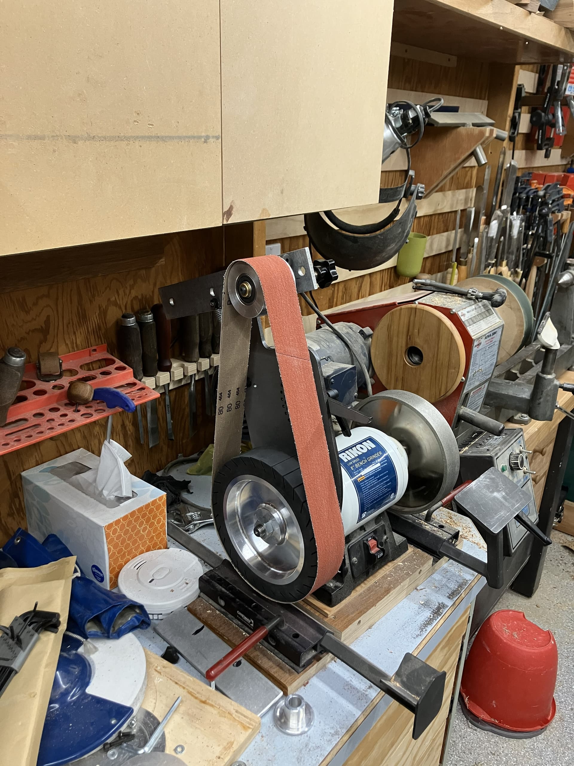 It’s worked well and met the design goal of allowing me to use the same woodturning tool sharpening jigs that I use on the other grinding wheel. It’s allowed me to change grits quickly and grind stuff that I don’t want to mess up my nice CBN wheel.
