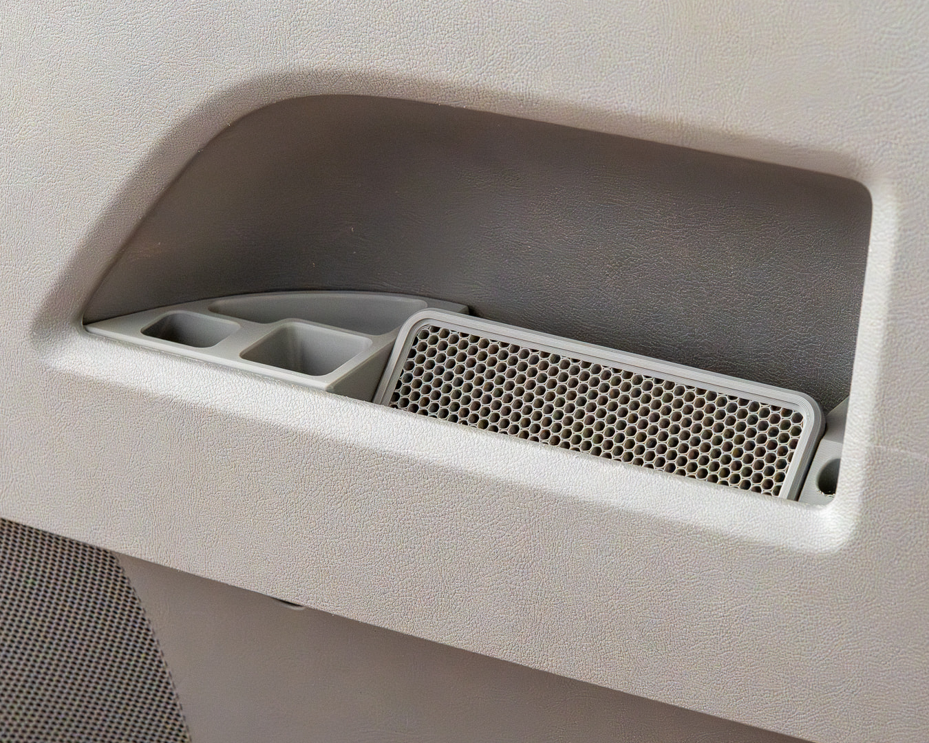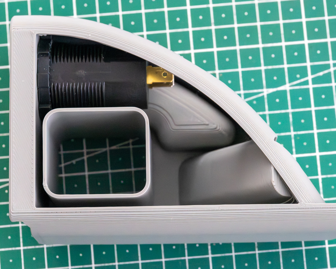 The standard VW pocket is large enough to lose things in, and the thought of a socket and a phone rolling around under assorted hardware didn’t appeal, so I made some stuff to make it work to suit me. I was going to embed the giblets from an Ikea wireless charger in the phone plate, and I may still do that, in the meantime the hex one looks nice and a little right angled charge cord arrives tomorrow.