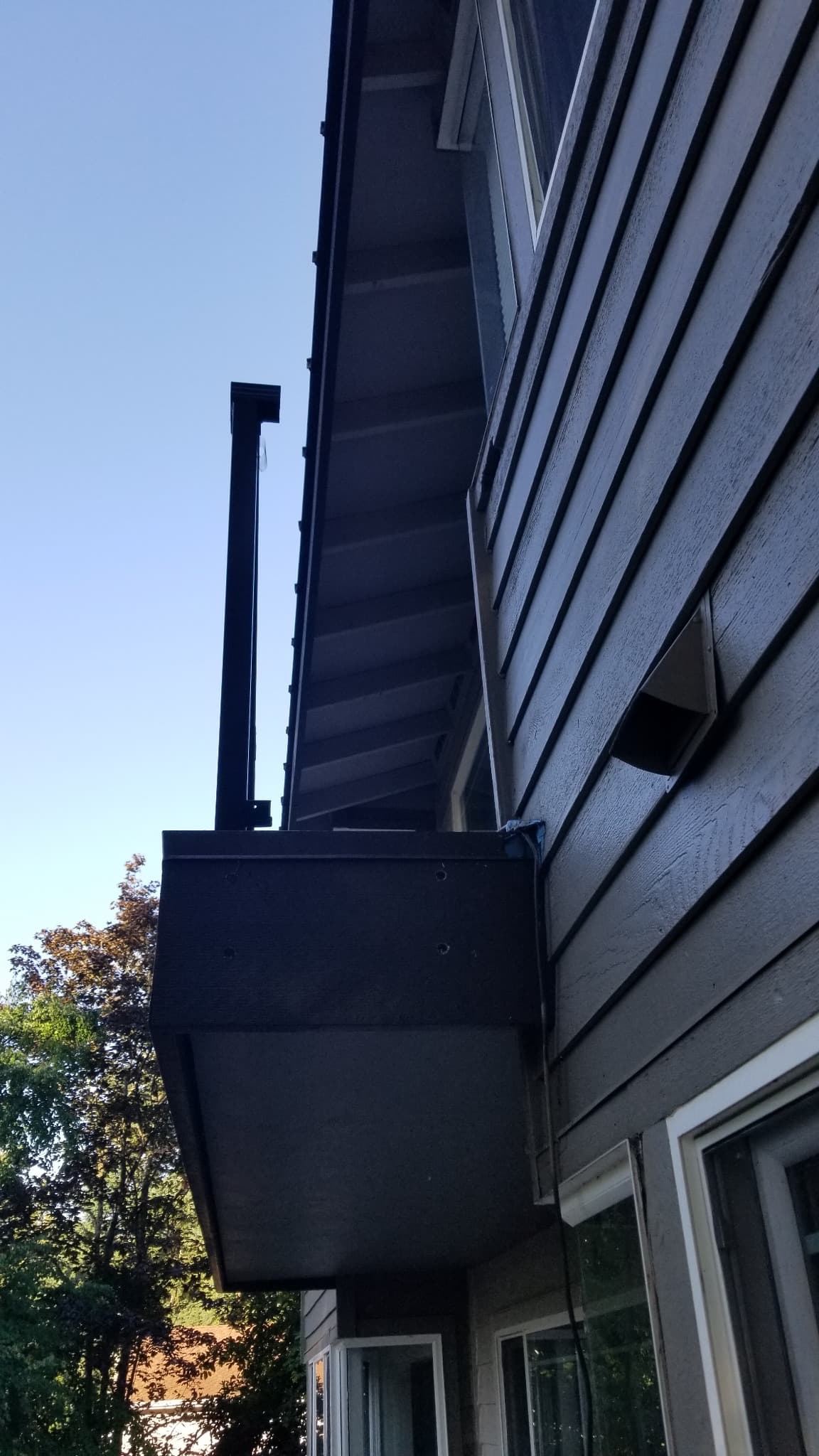 Intentionally don’t have gutters, am intentionally letting deflected water run off to hit the ground below. The ground surface has sufficient drainage to handle. Reason for no gutters… We have tons of needle spewing trees, I could never figure out a great solution for avoiding blocked gutters, I don’t enjoy cleaning the metal roof. Ended up deciding to not bother with gutters, and have made the ground handle water run off instead.
