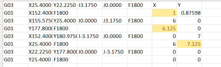 The G03 commands are the rounded corners. If you ignore the I and J parts, the X and Y determine the endpoint of the arc. The extreme X and Y values occur at the ends of the arcs. The extreme X values are from 22.2250 to 155.575 which is 5.25 inches. The extreme Y values are 22.225 to 180.975 which is 6.25 inches.