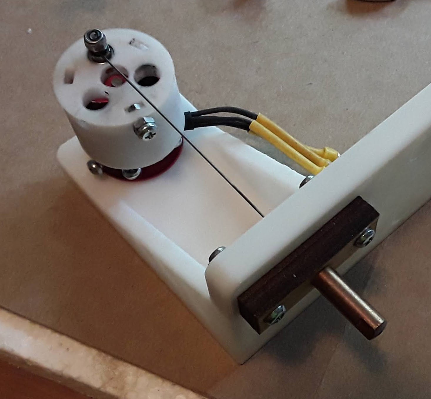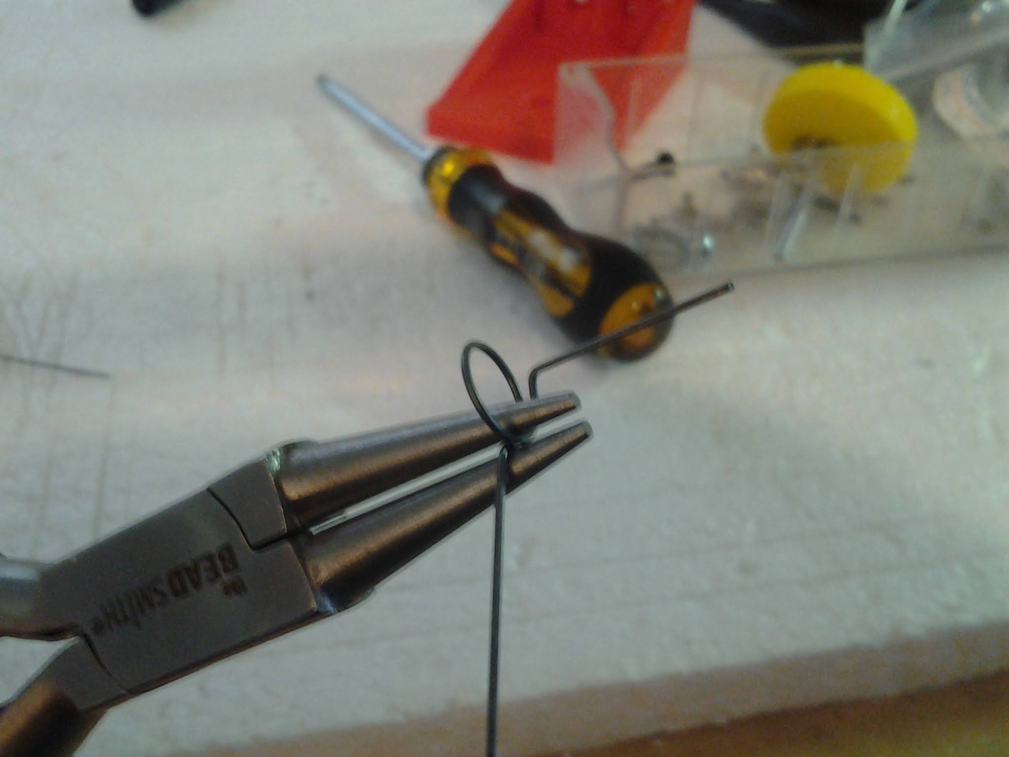 For the needle, I wrapped the 0.025" diameter K&S steel wire around a drill bit shank a bit smaller than the OD of the bearing to form a loop that needed to be slightly sprung open to slip over the bearing OD and then into the groove… and that little bit of spring pressure was actually enough to keep the needle firmly seated in the groove during operation. Also note that I offset the needle shank to “bi-sect the loop” with round-jaw pliers… this insures the symmetry and centered-ness of the needle blur.