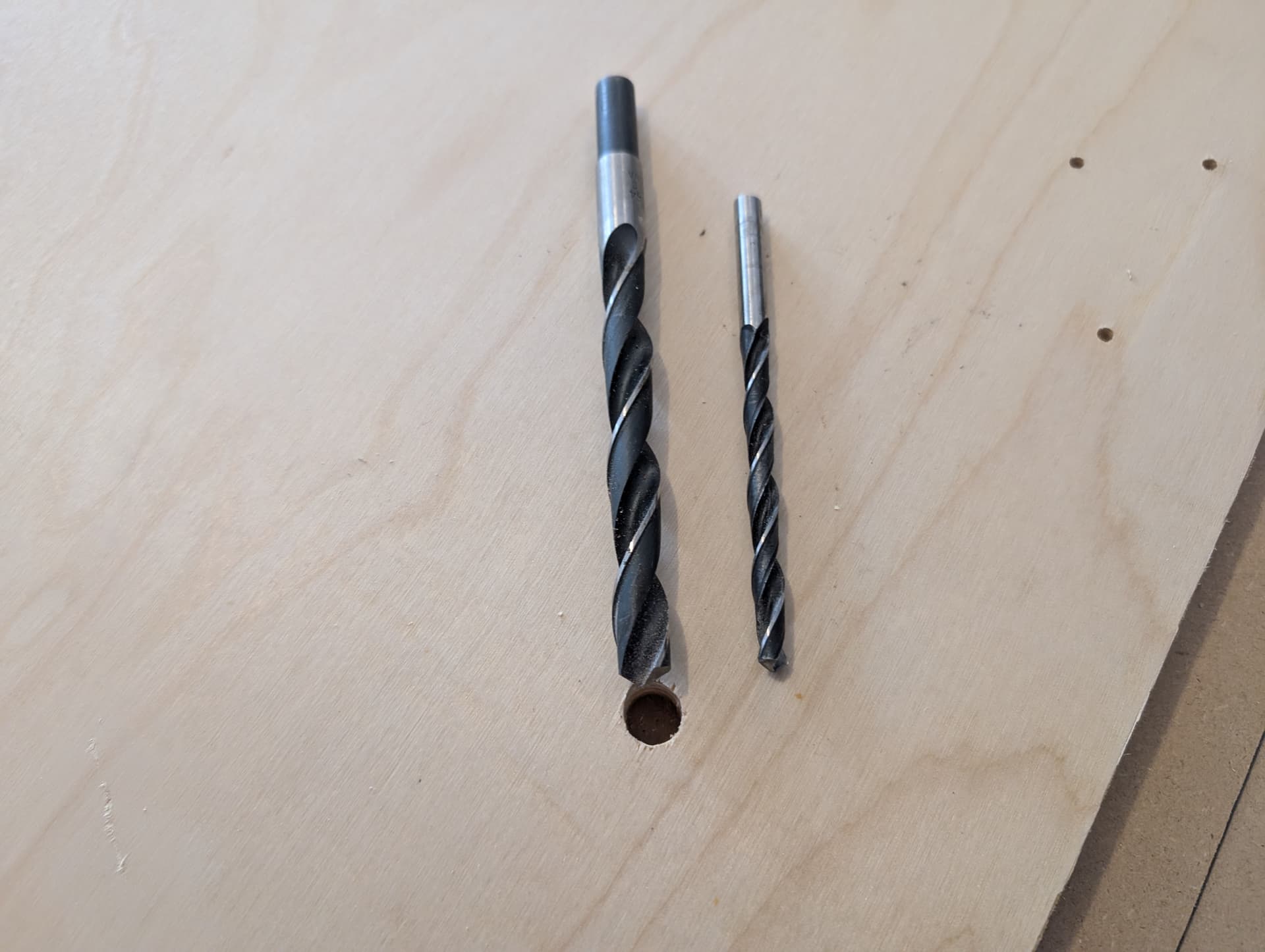 So I drilled all of my holes using a short 1/8:” bit to make pilot holes, and then I bought a drill block to help me to with making perpendicular cuts with the larger bits using a handheld drill.