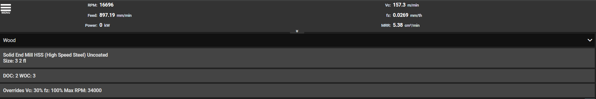 Everything seems to be correct in the FSWizard, except the chip load (mm/th) doesn’t quite match what I’ve determined, which would indicate insufficient cooling.