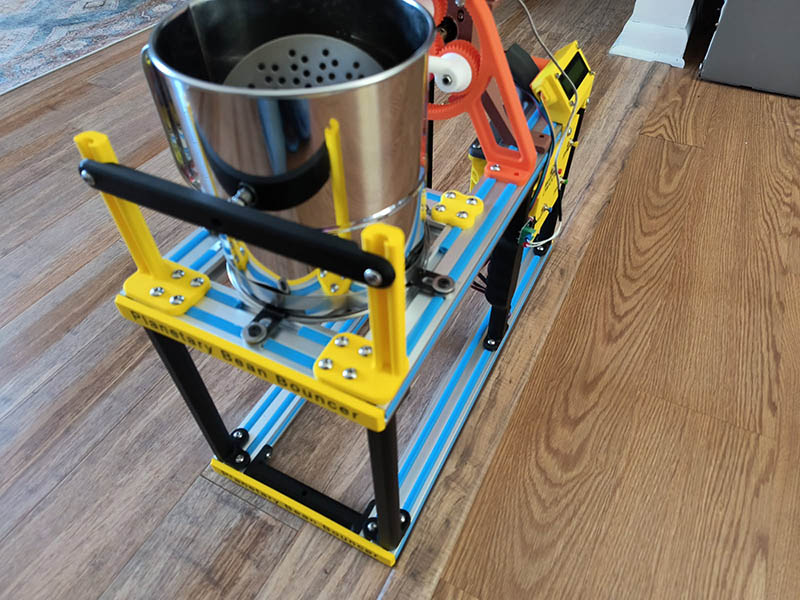 I also redid the frame using V-Slot 2040 on the bottom since I found some from another project to repurpose for this one. That makes the frame a lot simpler design. I also added handles mid-way into the center supports for grabbing when pouring the beans out. The center supports are not really needed for structure but do give a good place to grab on one side and give some mounting spots for the MAX6675 and cable ties for motor wire.