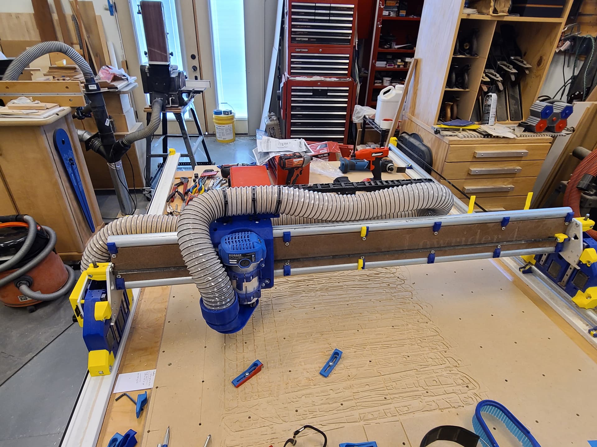 One issue that you’ll have to cope with is the fact that for a full size table you’ll quite a bit of clearance so the hose can travel end to end. My table is 72” x 42” so it’s not quite the maximum. Also since I use the SKR 1.3 control board, and have its display mounted on the end of the gantry, the only two cables that must leave the gantry are the router power and the control board power. All other electronics are completely contained within the gantry itself.