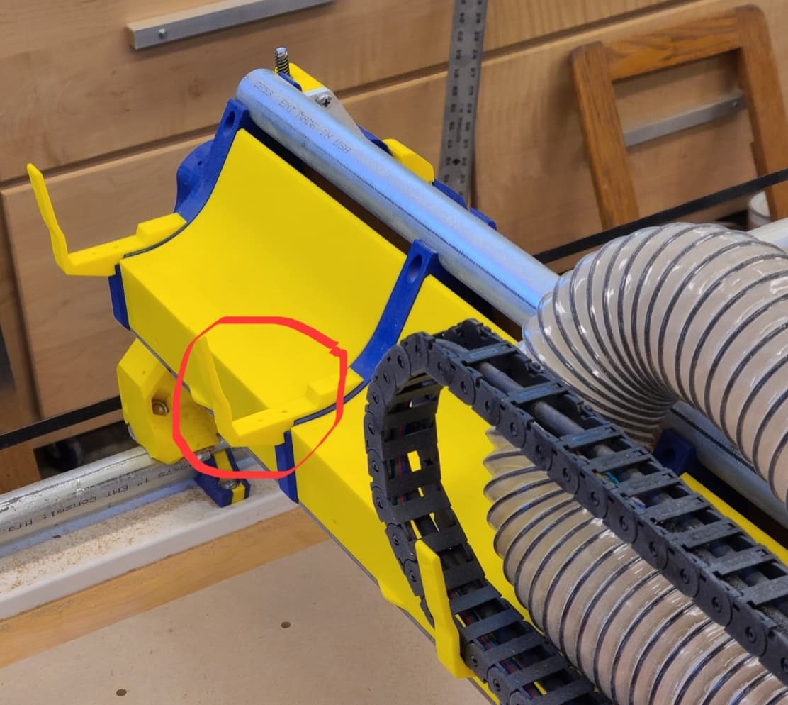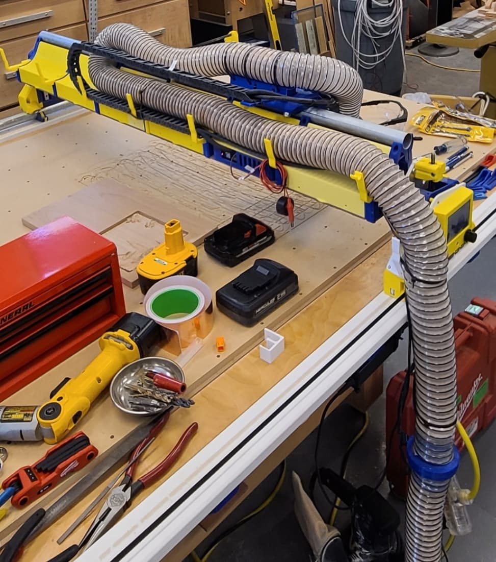 That is a great design! I am dealing with a similar issue I am in the final steps of my build and I am having trouble with the cable/dust hose. I have built my dust management to be under my table since it is in my garage and I am limited on space since I went for a full size table. I have big plans lol. Could you please share the files that you printed or the modifications you made to the makers files that you used. I have the drag chain and would like to try this setup to see if it solves my issue before I start reinventing the wheel. Thank you Dustin