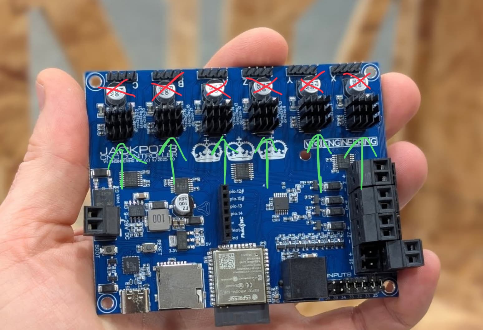 OK, I went back to the Primo after dinner with my iPhone and, of course, could not get Error 14 no matter how I tried to reproduce the actions I took during the afternoon. But I do have the data a from the $SS command, a picture of the board, and a couple of files that caused the error. Hard to tell how the unit is wired up from the picture but it is exactly according to V1 documentation for the Jackpot 2 board and using all cable and hardware purchased from V1. Except for Error 14 the unit, which has the duel stops on X and Y, is running perfectly.
