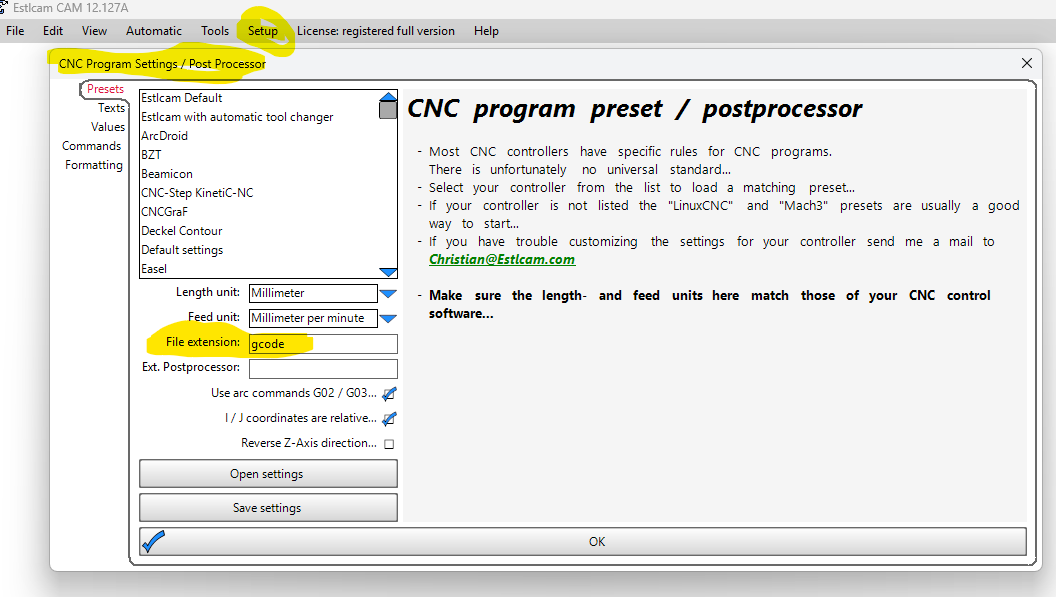 EstlCAM defaults CNC Program output to .nc file extension. You can change this behaviour in the Settings - CNC Program Settings/Post Processor window.