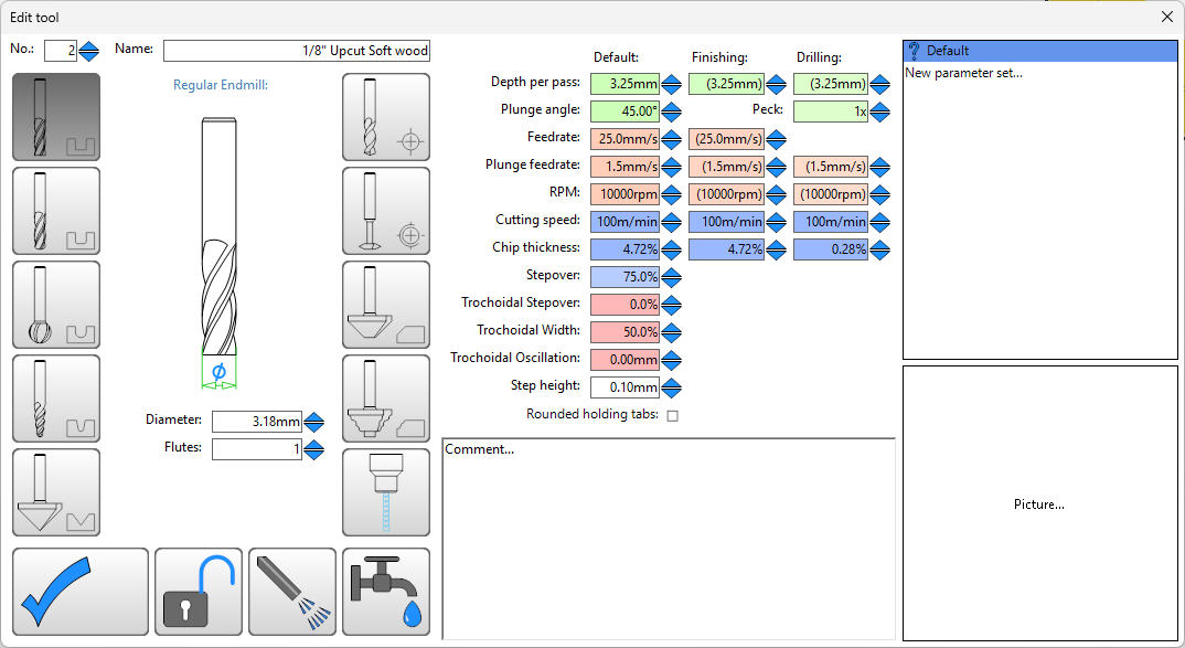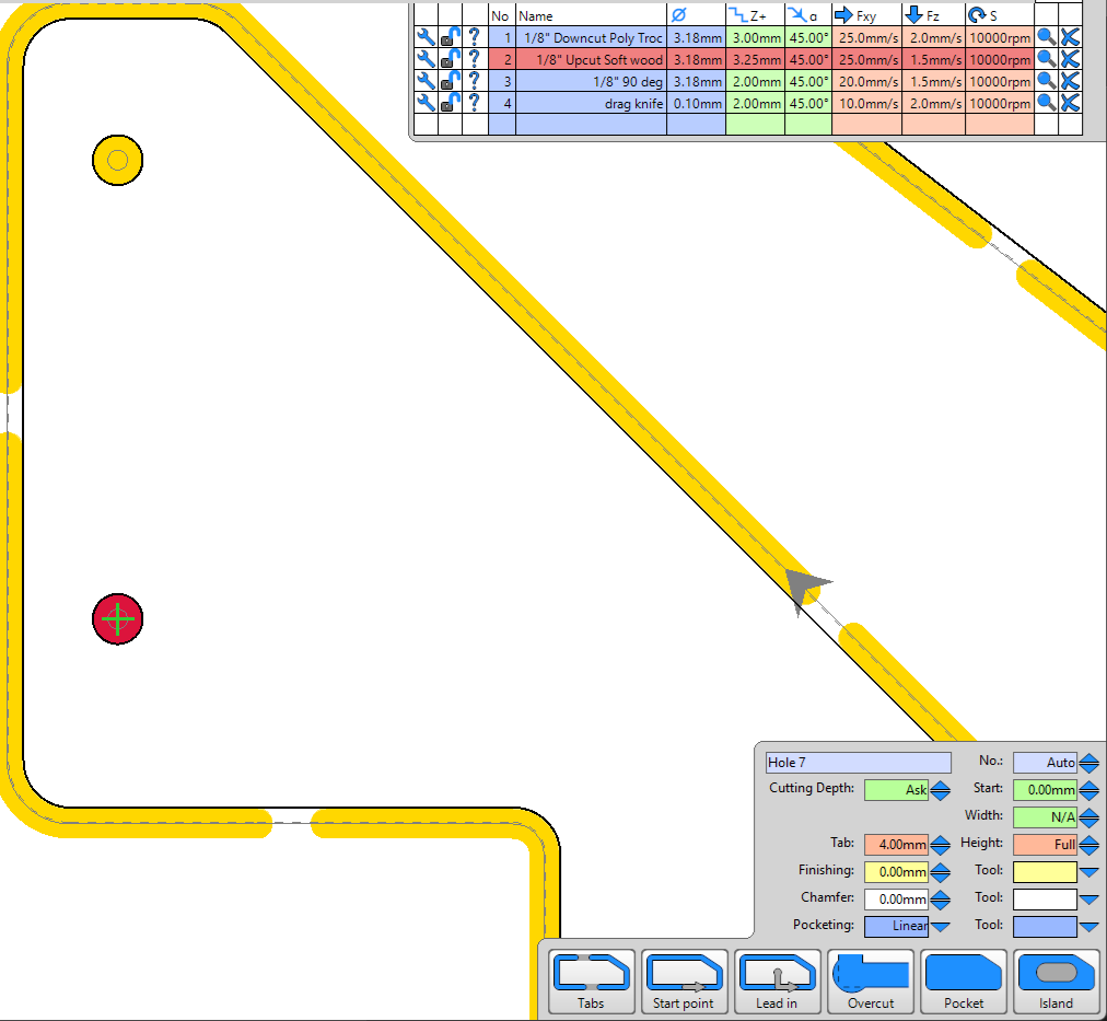 When the hole is bigger the tool will plunge to DPP, switch to the X/Y feedrate and spiral out to expand the plunge hole, switch to Z feedrate, plunge DPP… Even with a X/Y feedrate that is 2x (VS 16x!) the Z feedrate, the speed change is noticeable and X/Y seems really fast on small holes (VS straight cuts). Setting up a small hole ‘tool name (dupe)’ (won’t cause a tool change) with a smaller DPP and a really shallow ramp could allow setting equal feedrates, e.g. increasing Z feedrate and decreasing X/Y feedrate.