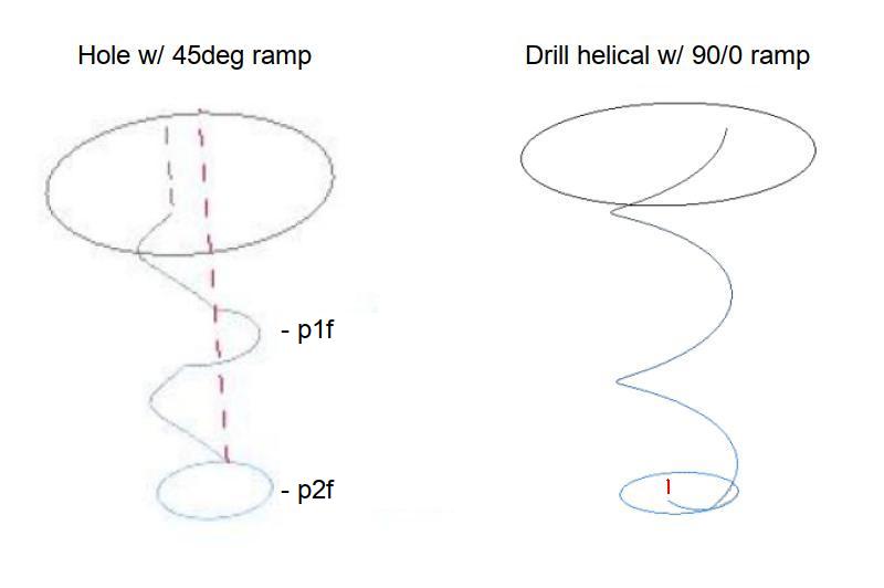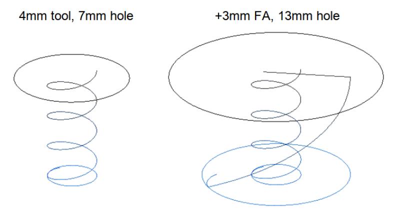 Adding a same tool finishing allowance (FA) to cut bigger (than maximum single plunge) holes is significantly faster than cutting small stepped (Z > X/Y > Z…) holes. While holes up to 3.25x the tool diameter can be cut with a second full depth FA plunge (steeper ramp), going that big requires a large (e.g. 75%) stepover. This seems best suited for holes that are closer to 2x tool diameter, e.g. 8mm holes with a 4mm tool, P1: 4 x 1.75 = 7. P2: 8 - 7 = 1, 1 / 2 = .5 FA).