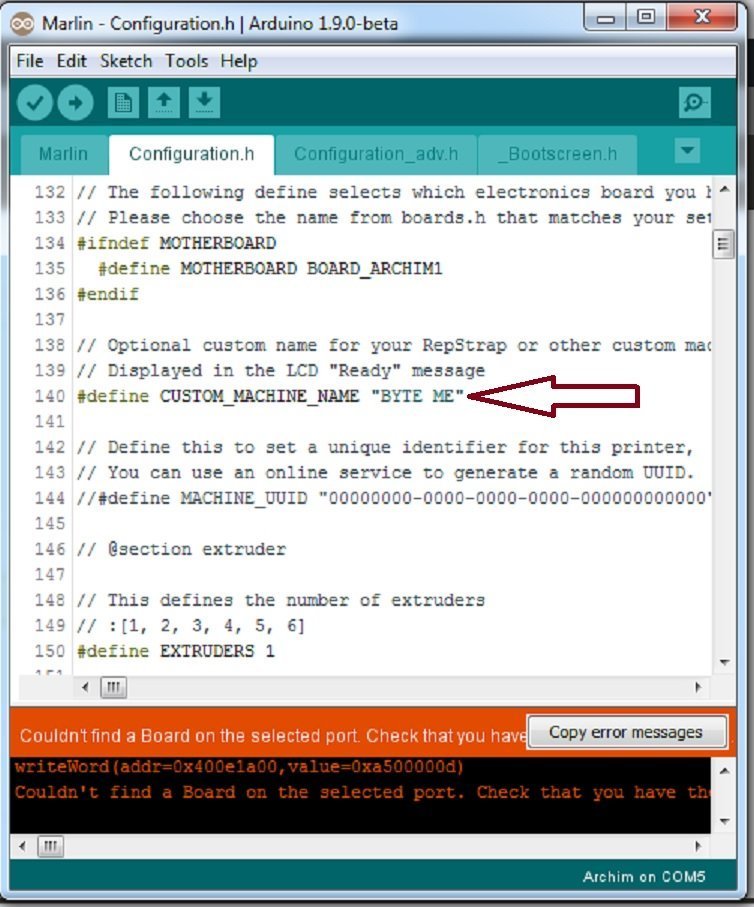 One other thing I did happen to notice when going back and rereading this thread. This may be the clu you all needed as well… The first screenshot of my Device Manager shows the Archim rebooted after flashing with the name of “V1 MPCNC” This was the name I wanted the LCD to display at the ready screen from line 140 in the Configuration.h tab. The default is “V1 E CNC” Now I have absolutely NO idea whatsoever why changing line 140 would result in something like this, but maybe you guys might have an idea. Line 140 is the only referenceI was able to find for “V1 E CNC” I’m guessing the reason Bill never found a reference for V1 MPCNC was because It was something I’d Changed before uploading and should have been innocent enough of a change… HA HA HE HE! How little did I know!!!