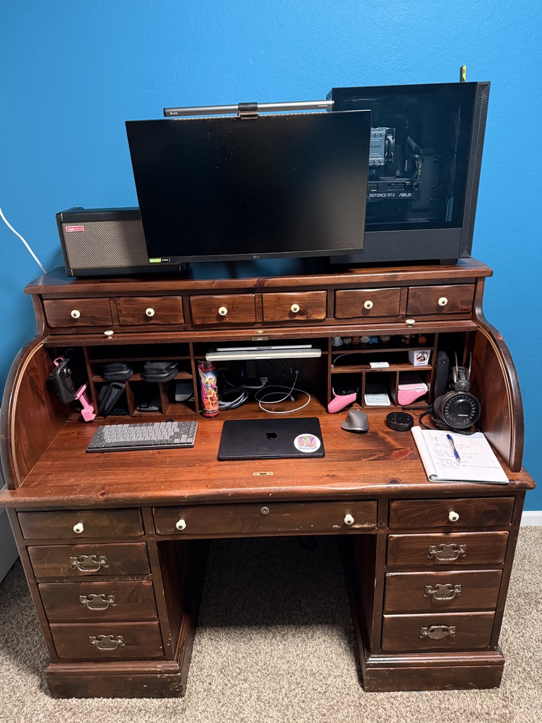 Big upgrade from the roll top desk I had before! I was able to break most of it down and save the big pieces, it’s all just pine tho, made in 95. Dismantling it did show me how the roll top works, it’s literally just a bunch of wooden slats, glued to a piece of burlap… I can’t wait to make crazy roll up things on the CNC sometime soon lol
