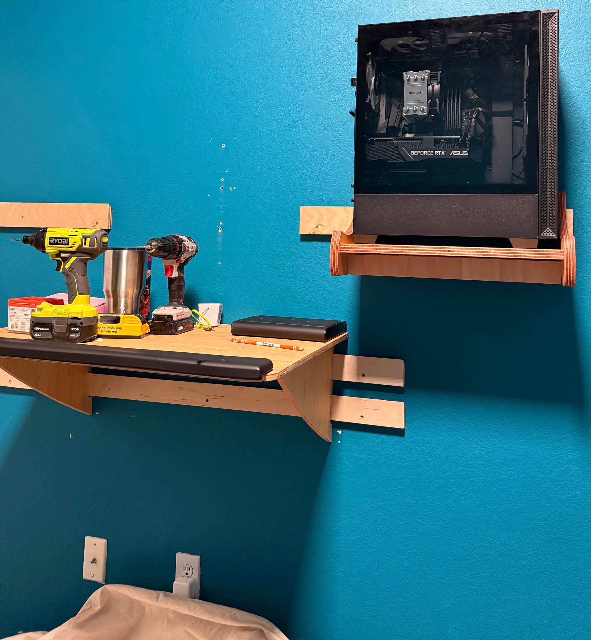- I should have left a small gap between the desk’s rear edge and the French cleat legs, such that there would be a gap between the wall and the desk. I say this because the CNC cut the table top straight, but the wall is not straight. NBD once you put a bunch of shit on the desk and can’t see it anymore lol.