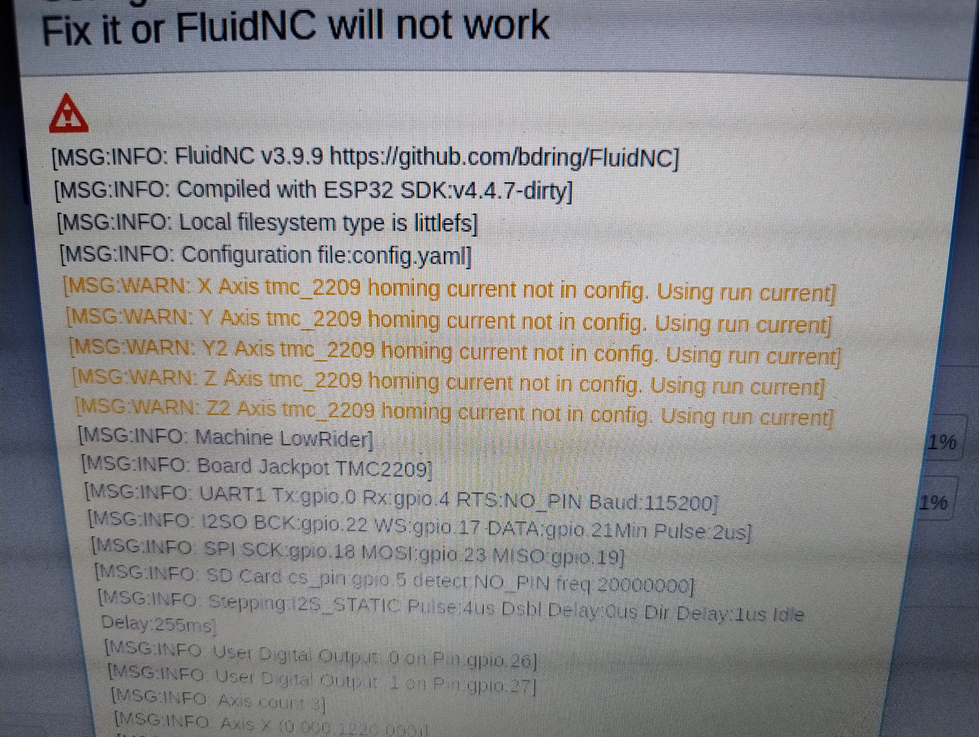 Now seeing these warnings in orange with the recommended firmware. Have I stuffed up here or is it an easy fix to just specify a “homing current” for the motors?