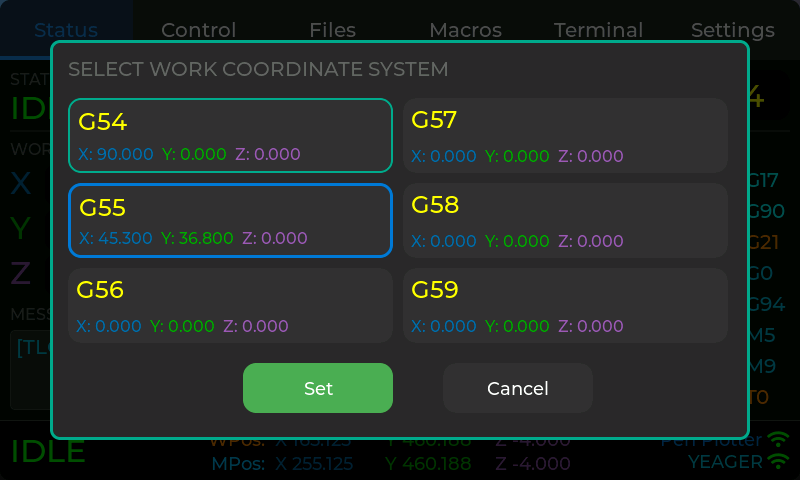 Just replicating the tablet tab of FluidNC you can either enter a number and jog directly to it or enter a number and use ‘Set’ to update the current coordinate.