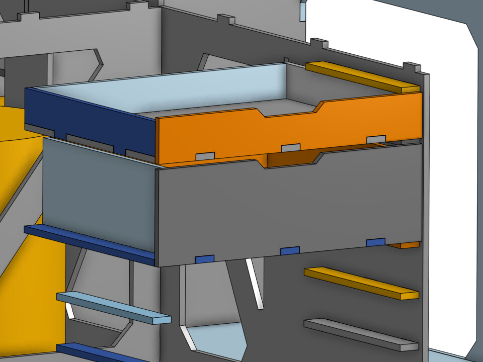I like the crossed frame concept, and the tabs but wonder if you’d be better off just building separate carcasses for the drawer units and sliding them in?
