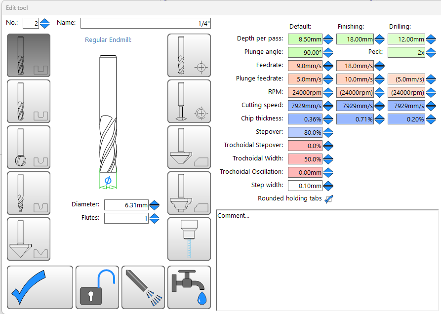 - I am going to drop the plunge rate 1mm/s, increase the feedrate 2mm/s and finishing pass probably 5mm/s