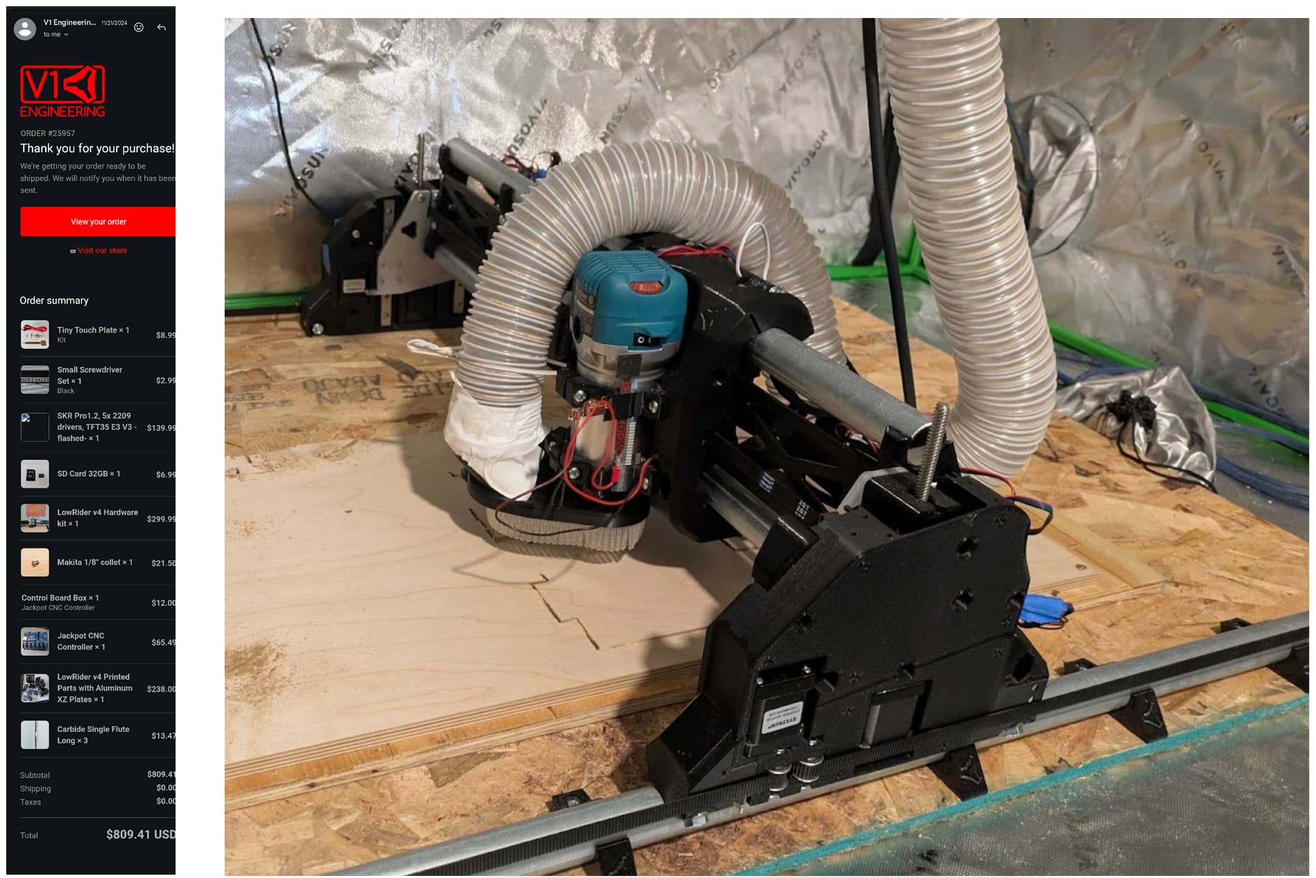 I’m selling my fully assembled and tested LowRider V4 CNC. All parts were purchased directly from V1 Engineering and from their official Amazon buy list (see V1 order from last fall in image below, everything is in the build shown below- I am keeping the router). The machine is complete, runs well, and is ready for you to set up, square, and start making.