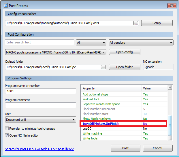 Yet the logs appear to be empty. Happy to debug this myself, not sure where to start though. How do people develop these processor extensions? In Fusion360 or elsewhere? Seems like I canāt even put a local post in ~/Autodesk/Fusion 360 CAM/Posts as suggested in the Autodesk help docs.