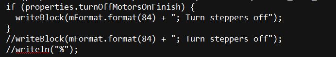 First I wanted to say thank you for making this post processor. Iāve been using it for a month or so and have been very happy with it. Iād like to make one modification though. Does anyone know how to prevent it from adding M84 at the end of the program? I looked through the post processor in Notepad and couldnāt find anything obvious to prevent it from adding M84 at the end.