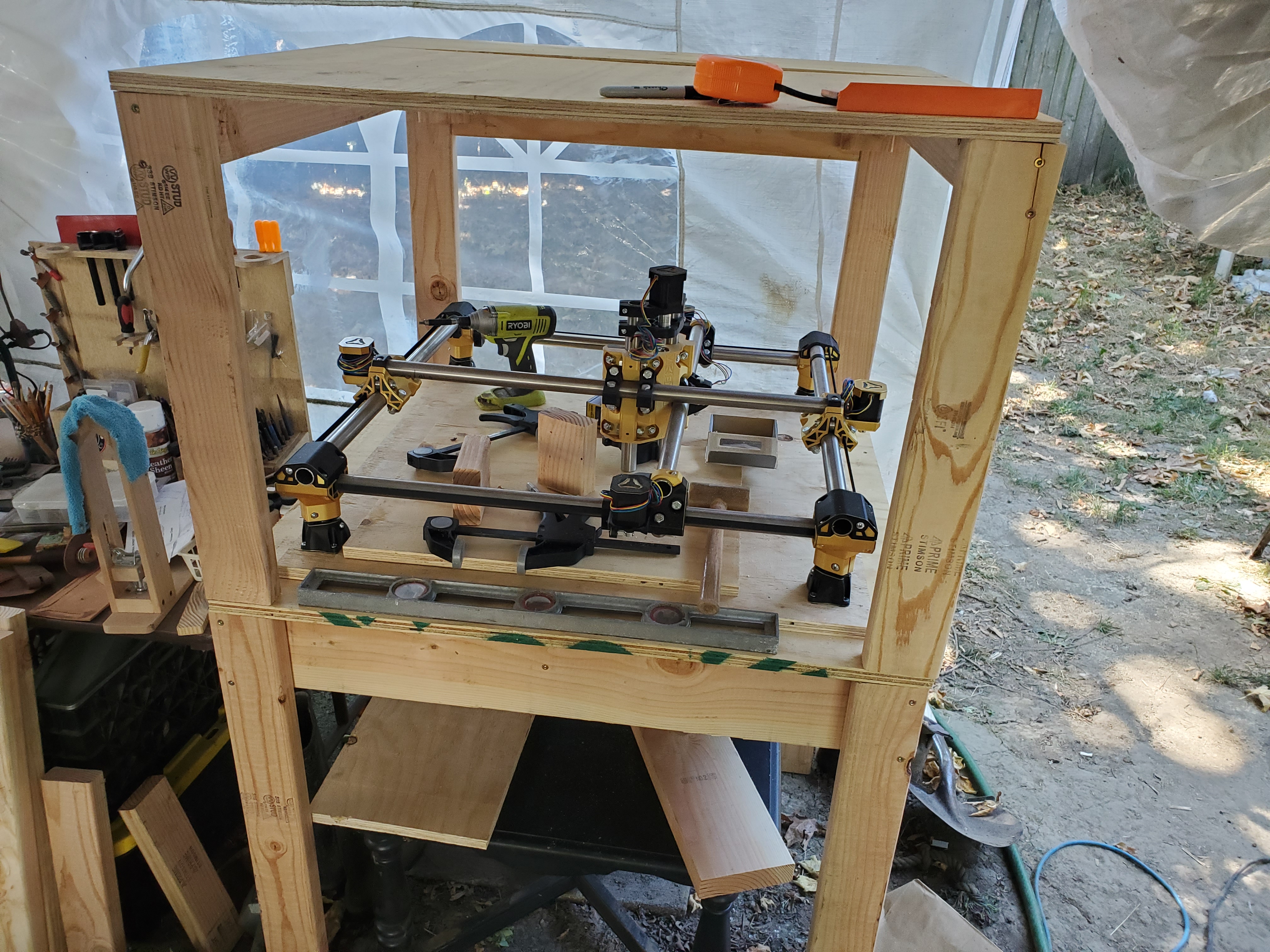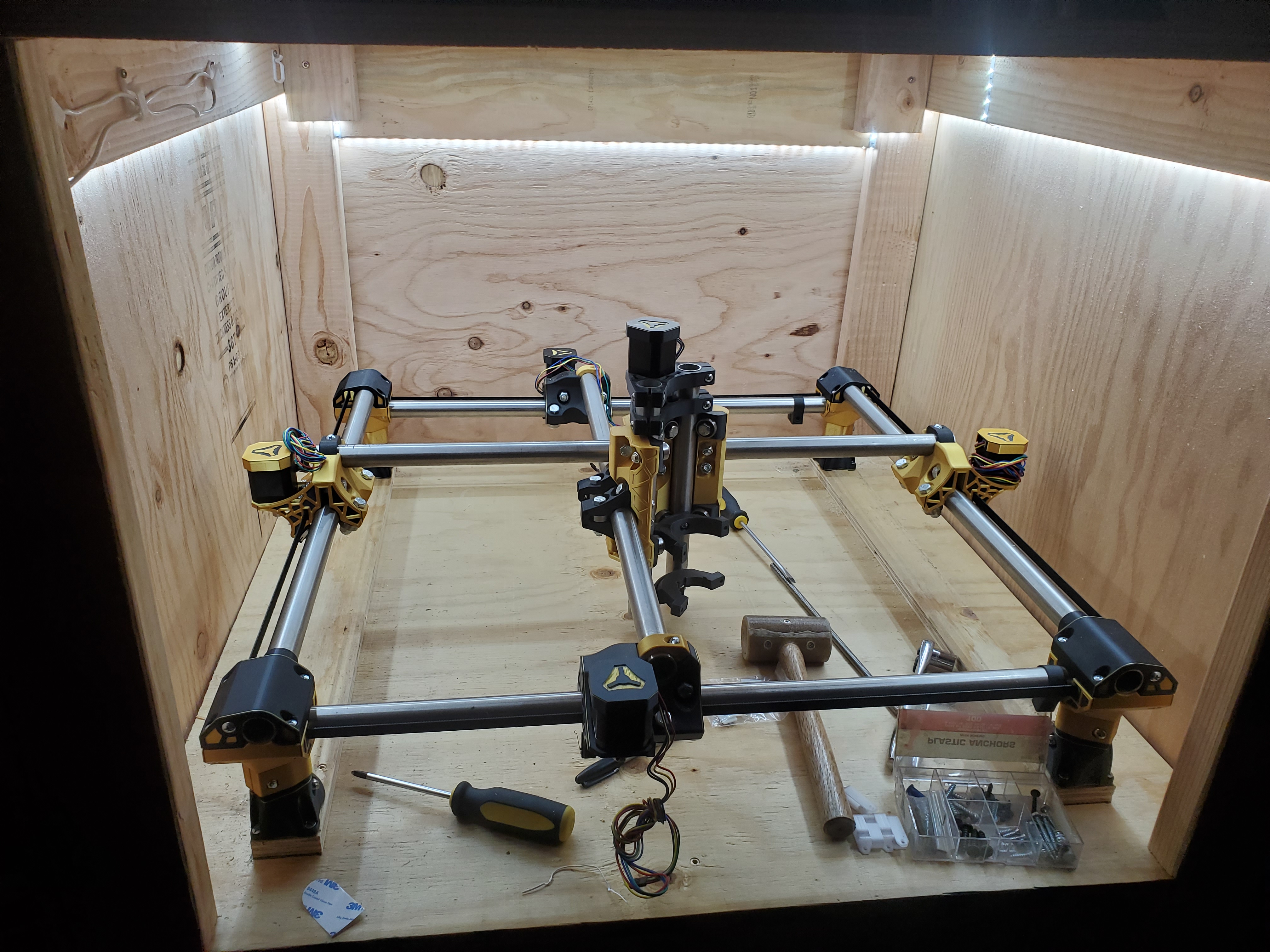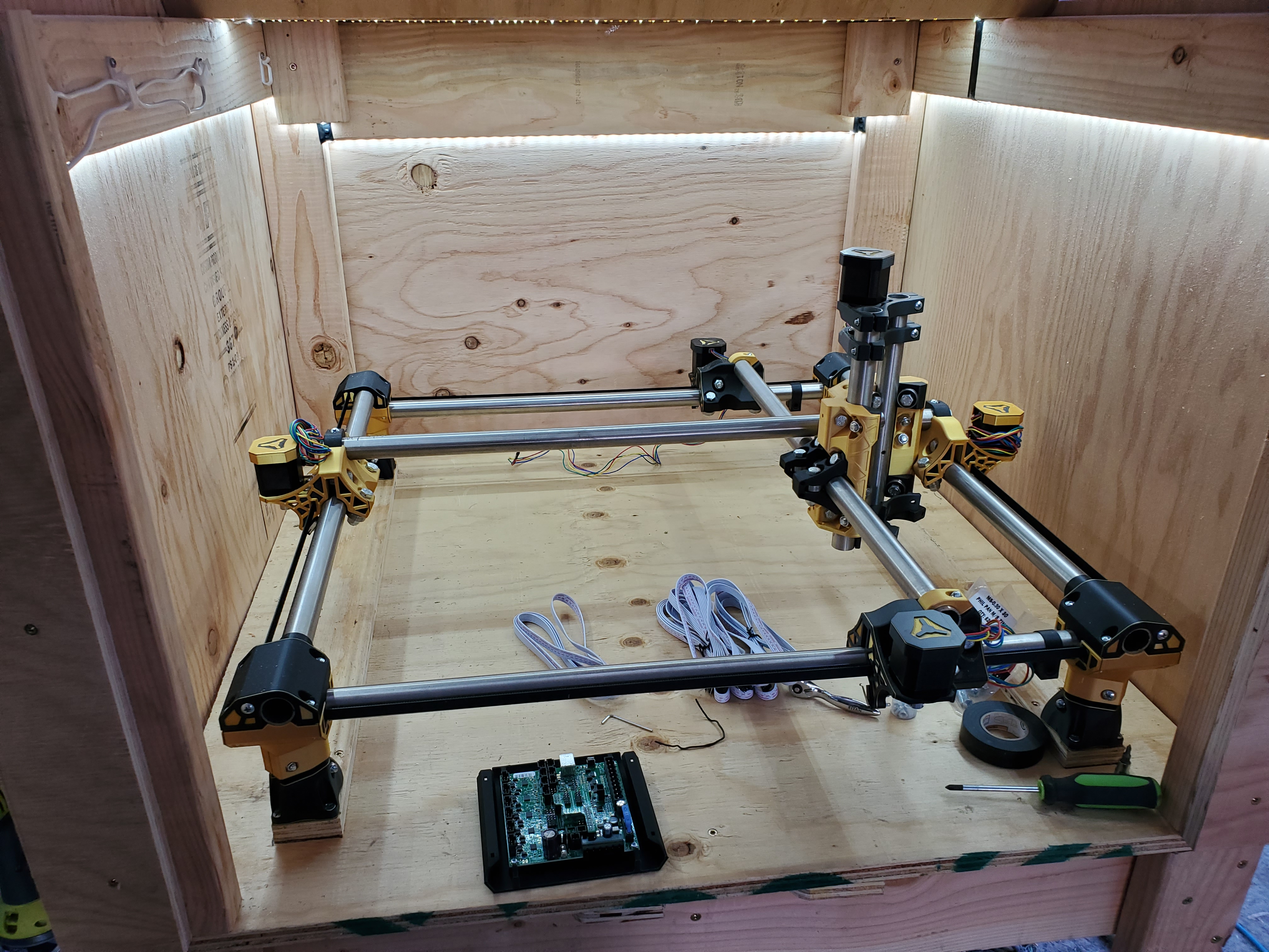 Alright V1 Fam! This is the first chance I have had to share my progress since my last set of images. Here is the table / enclosure I have been working on. I really didn’t put a lot of thought in to it. My main thoughts were to make it fairly easy to work on (lid lifts up on hinges and the entire top is removable if need be), have at least some sound reduction and have enough space to add an overhead vacuum… Eventually. I also wanted to have my enclosure ready when I do the wiring so I can make everything look clean. More updates coming by the end of the weekend hopefully.