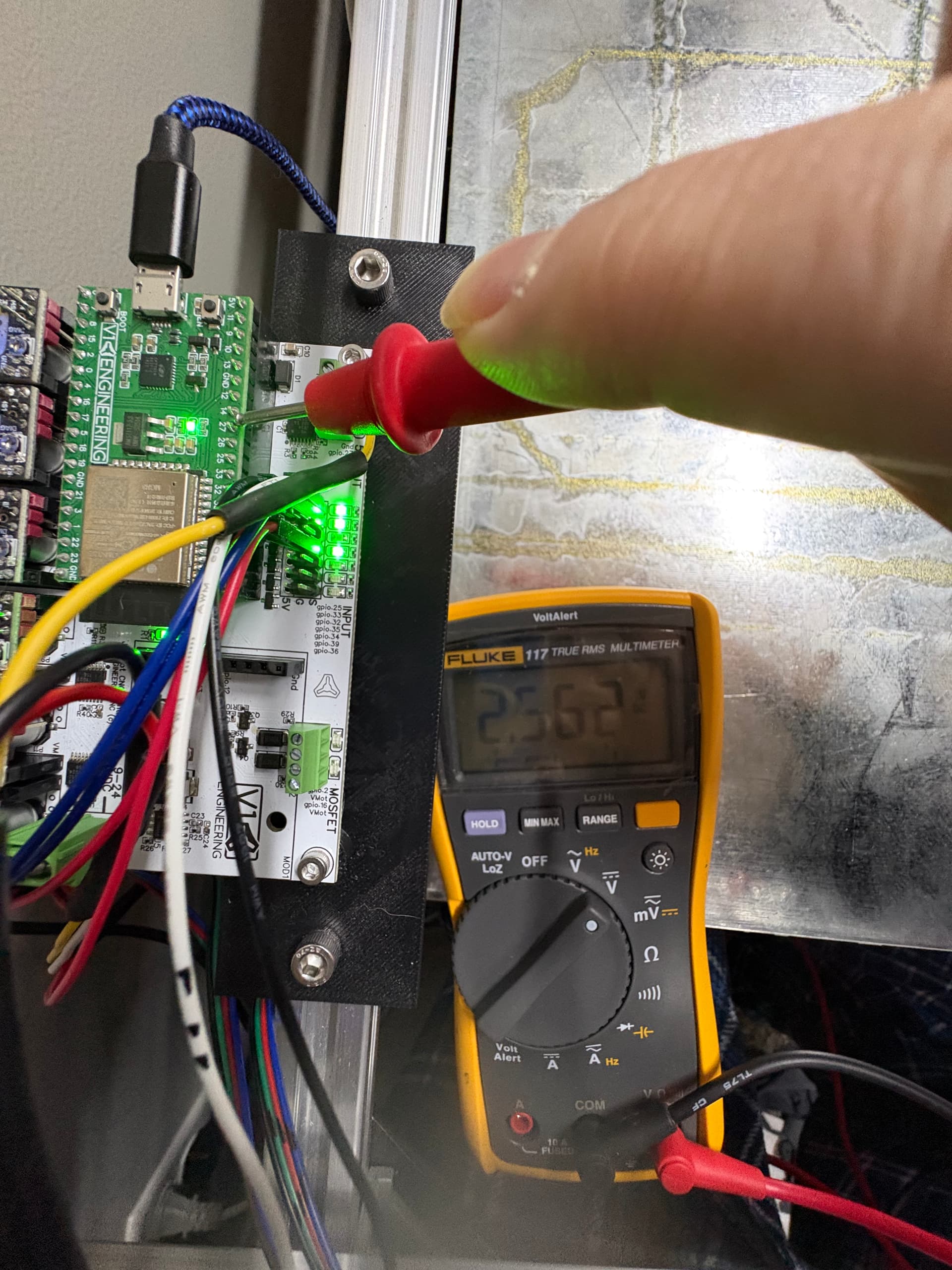 If you’re going to measure GPIO 26 or GPIO 27 on that jackpot, the DMM needs to have the return tied to the (-) lead of VMOT. If there’s no voltage there when there previously was, then you may have blown one or more GPIOs on that ESP-32.