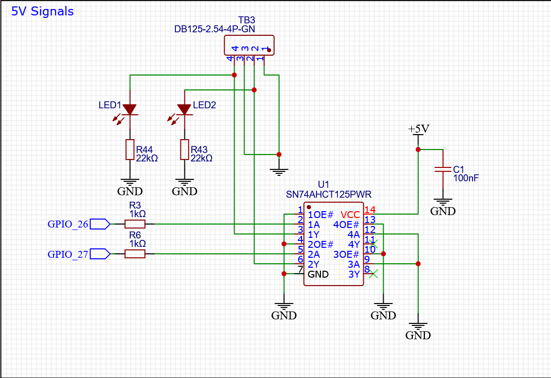 ok, so the line from the esp to the component stepping up the voltage from 3.3 to 5v is the culprit. I have continuity with 1k ohms to pin 5 on the component. then i have less than .5 ohms from pin 6 to the gpio,27 screw terminal. i think ill try to replace this component and see what happens.