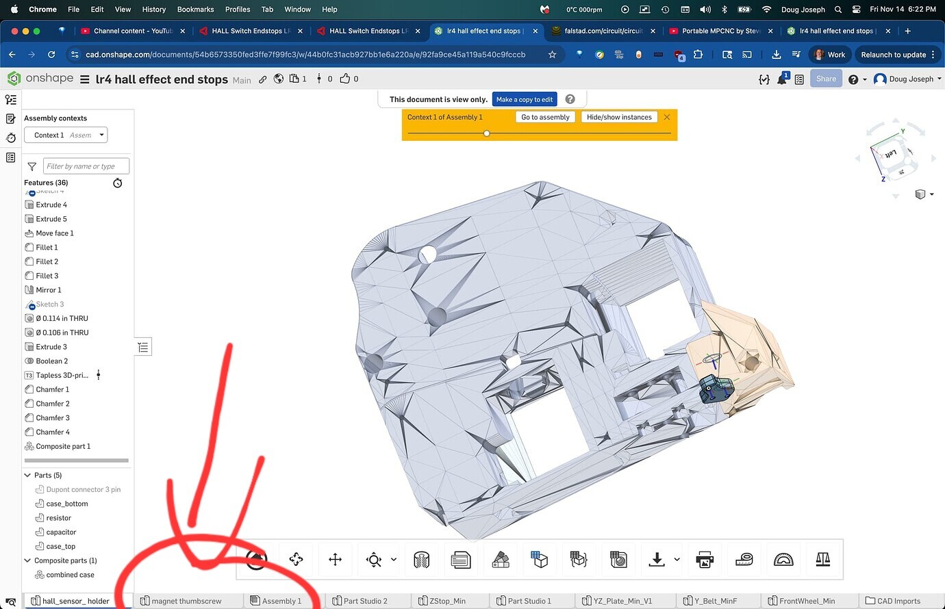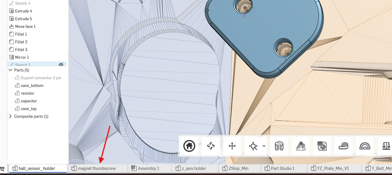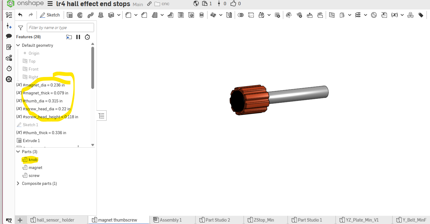 yeah, it’s in the same document. The tab is magnetic thumbscrew, then you can change the variables on the upper left to match your parts. Hopefully the names make sense. You just need the diameter and thickness of your magnet along with the head of your screw. To assemble you pop in an m3 nut, thread in your screw, then glue in your magnet. That’s the plan at least. When you’re ready right click the part knob highlighted below and export as an stl or step.