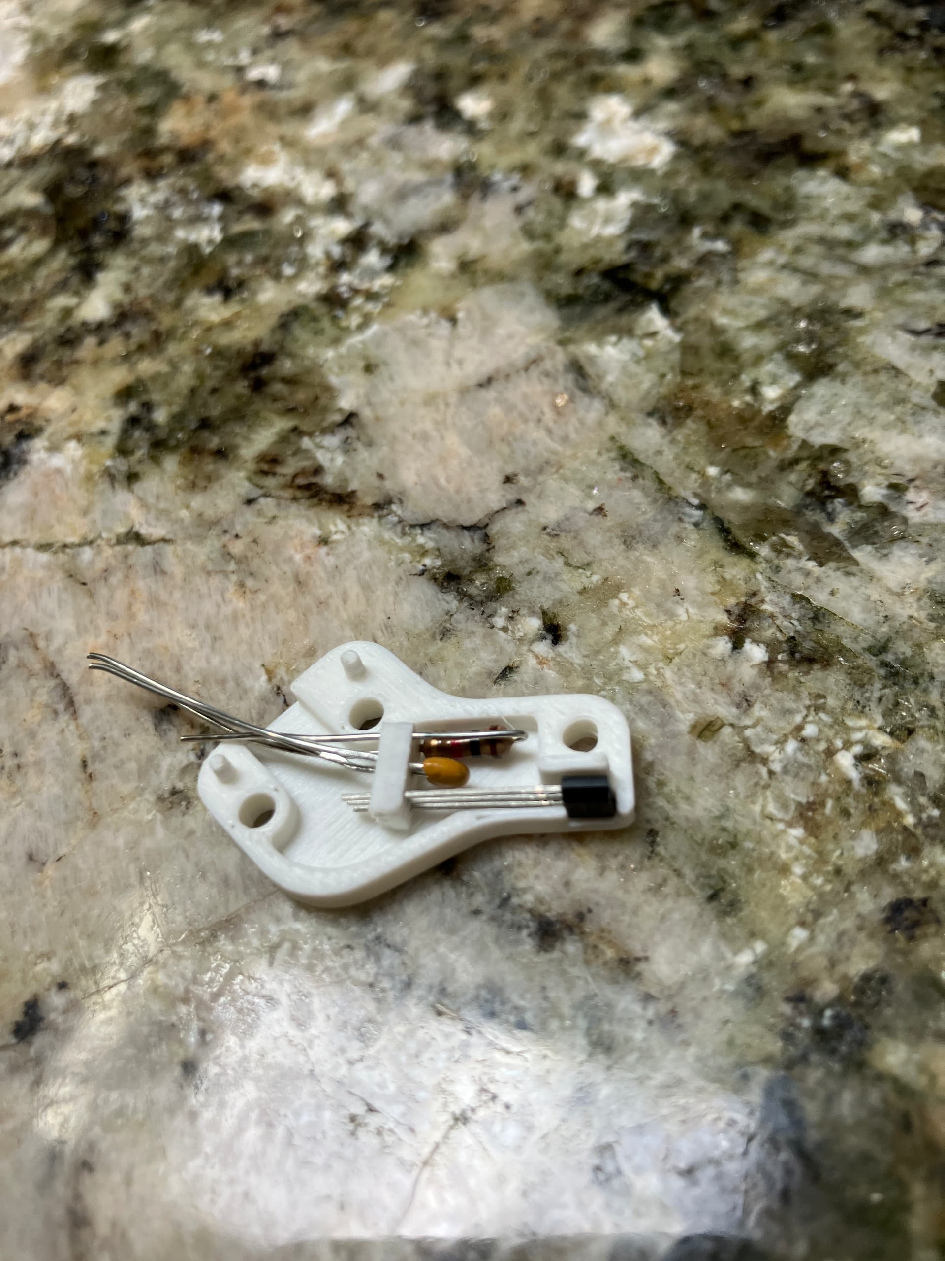 Also I’m overly pleased with this idea I had. I printed basically a waffle with grooves to mount the parts to, to give them some structure. I shifted everything around in the case until I was happy. Then I dabbed some hot glue on to hold it while I soldered it using the leads.