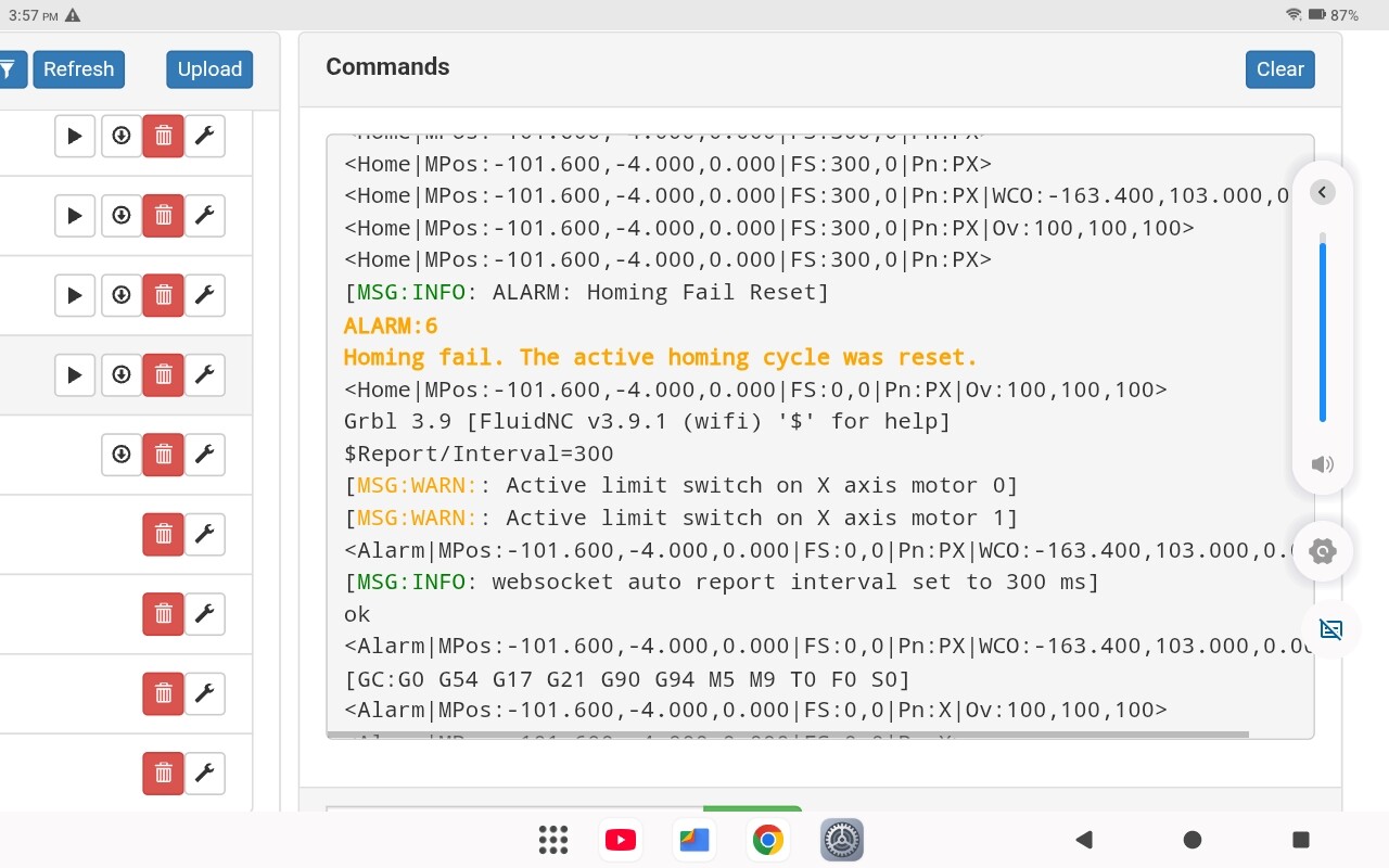 This will start the endstop troubleshooting in FluidNC. Press the endstops and release them one at a time, and see what FluidNC reports- paste that here.