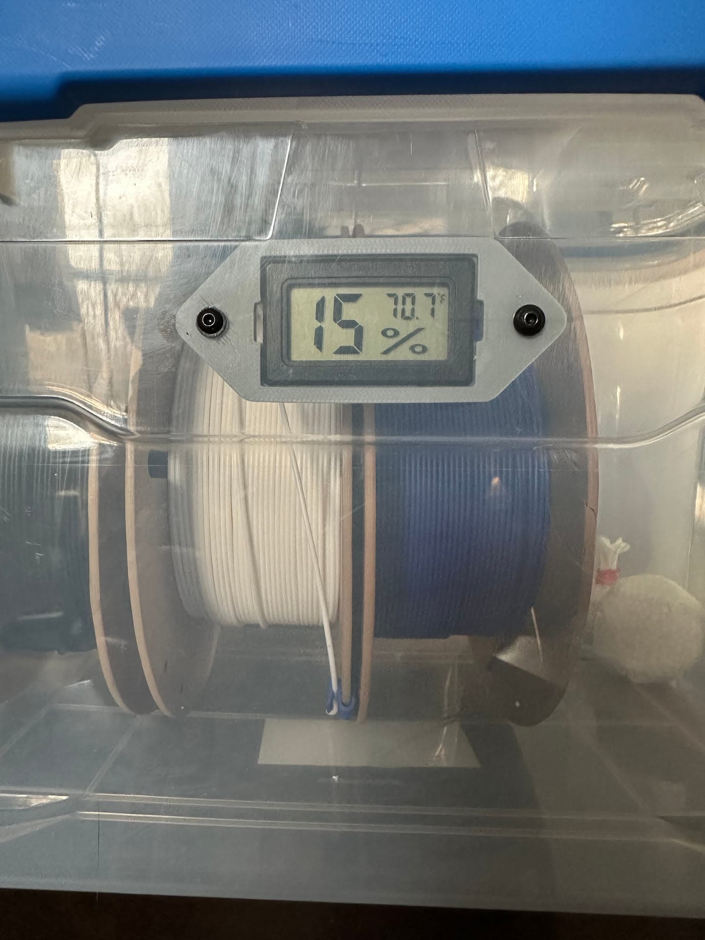 I’m currently printing some risers for my 4-spool drybox bin, but I checked the hygrometer this am and looks like the desiccant @MakerJim suggested is working way better than I’d hoped! I only dried half of the spools in here, and then not even for terribly long: