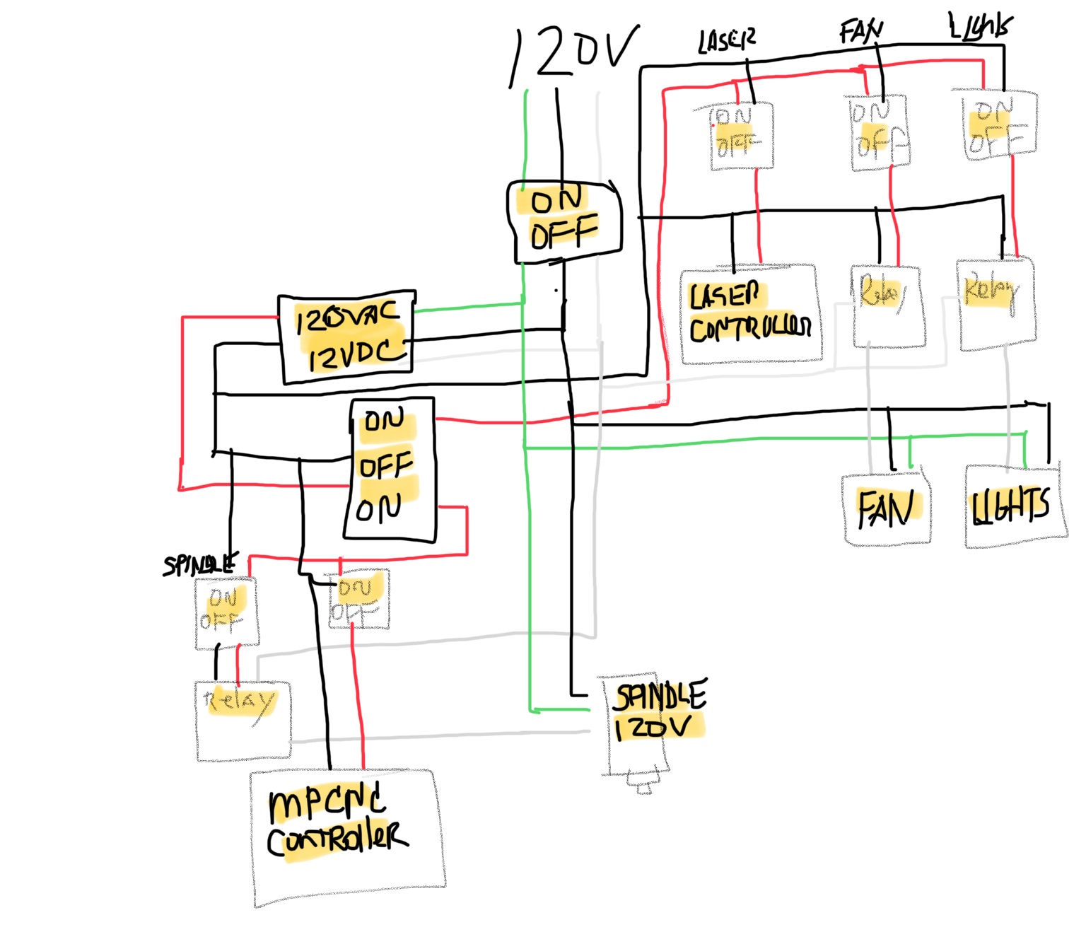 So now onto the final wiring. My plan is to incorporate both the MPCNC and my LASER machine into one neat spiffy unseen package while utilizing one power supply for both machines (which will NEVER run simultaneously). Here is what I came up with, will wire it up tomorrow and hopefully be ready for the crown over weekend. I’m getting excited again.