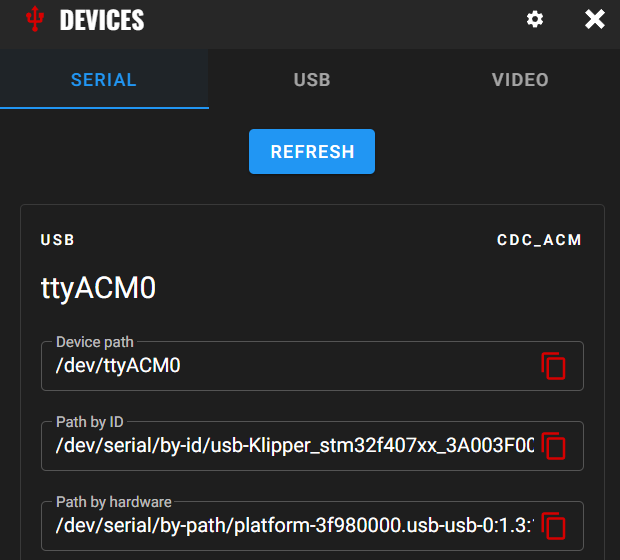 your device should show up. press the copy button to the right of the “by ID” line and paste it into your cfg text in the [MCU] section similar to below but without the ******