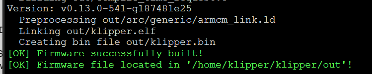 in that compile step, if you don’t see the klipper.bin file name before it says SUCCESSFULLY BUILT! then you need to update klipper and recompile.