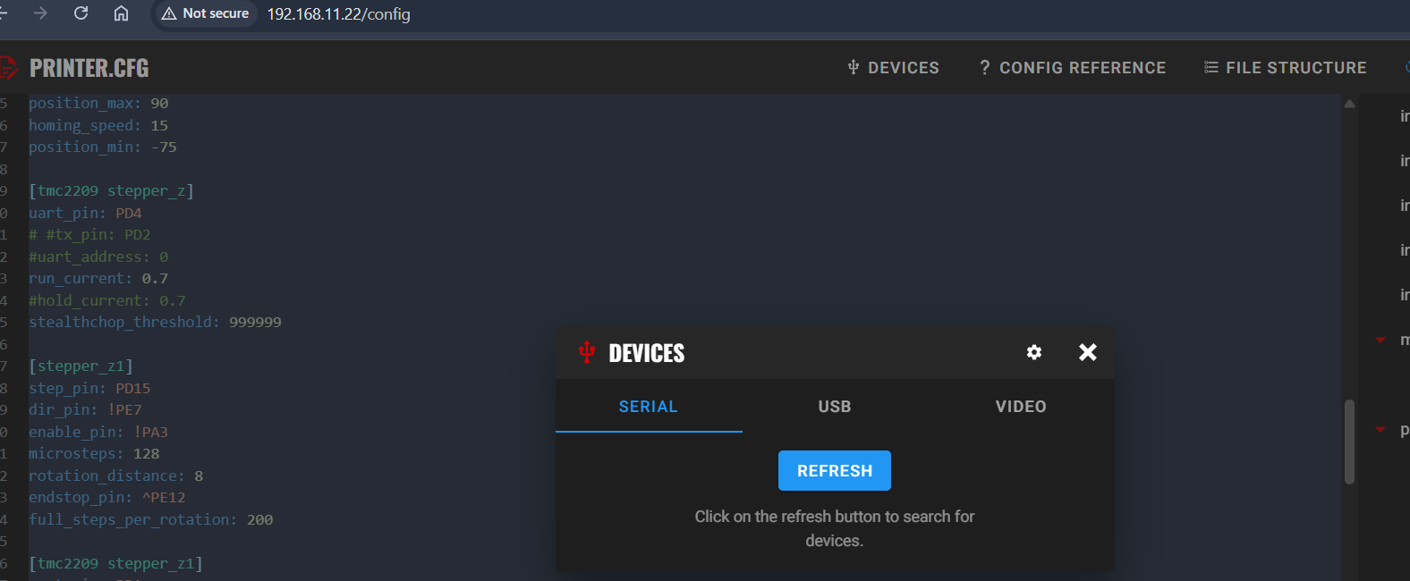 then click on the printer.cfg file. If you device says ERROR, this is ok. It is because your printer.cfg isn’t correct and you don’t even have the USB to your controller plugged in yet. with nothing plugged into the control board, plug it in to the USB with the USB jumpered so it will power on and press the device button at the top of the page:
