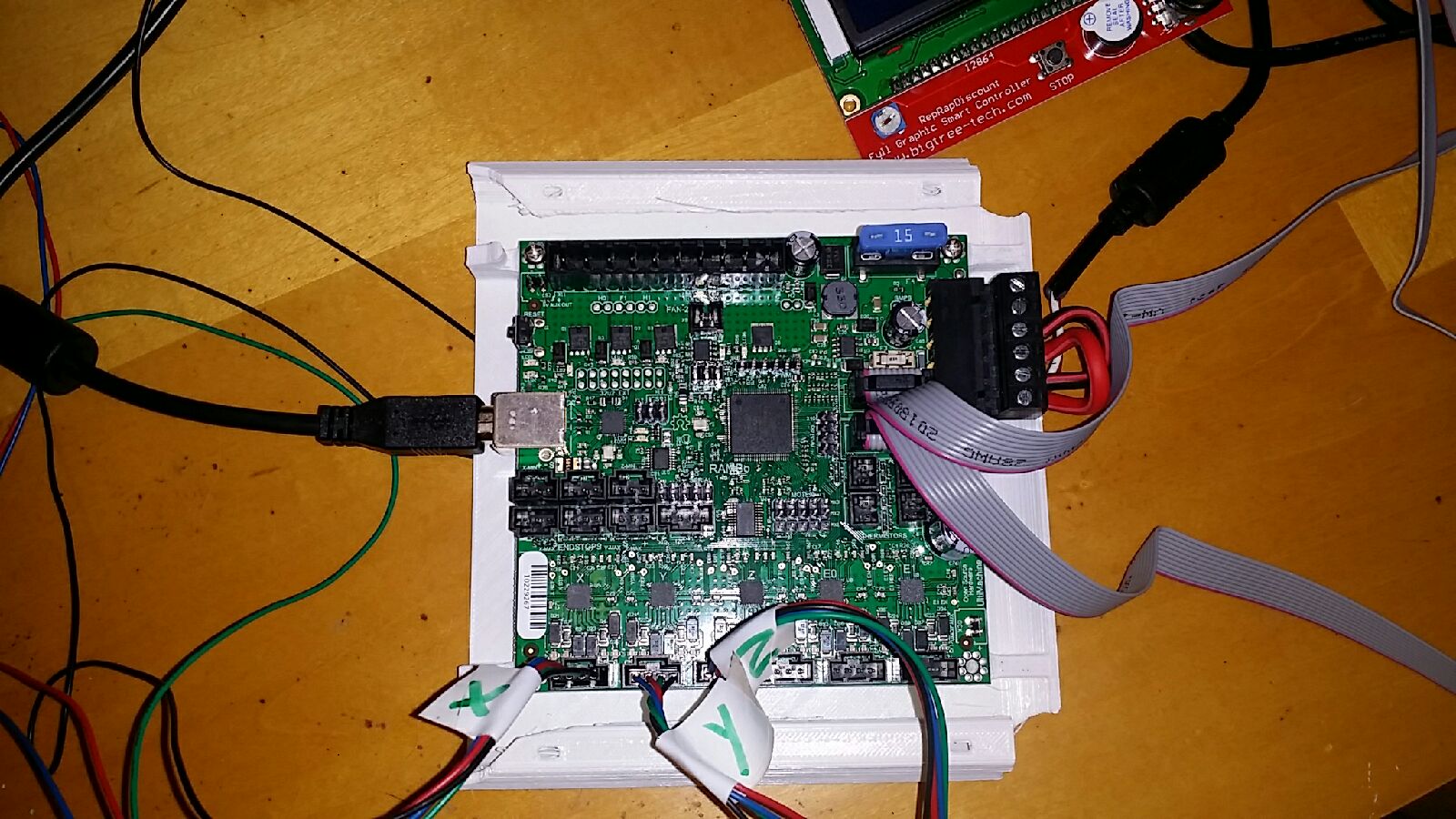 Hello I reconnect the rambo card to the Estlcam software they are in communication immediately after your comment that I might have flashed the card with their firmwire or something like that, I said yes it is possible I find the order "remix control as before Estlcam l uses, what I did, now a green LED and a yellow LED flash slowly continuously, but nothing came back on the LCD screen is blue, I link again with Repetier host I see that it communicates together but I can not do anything else, I tried to reflash with the method on your site but arduino displays an error after compilation.