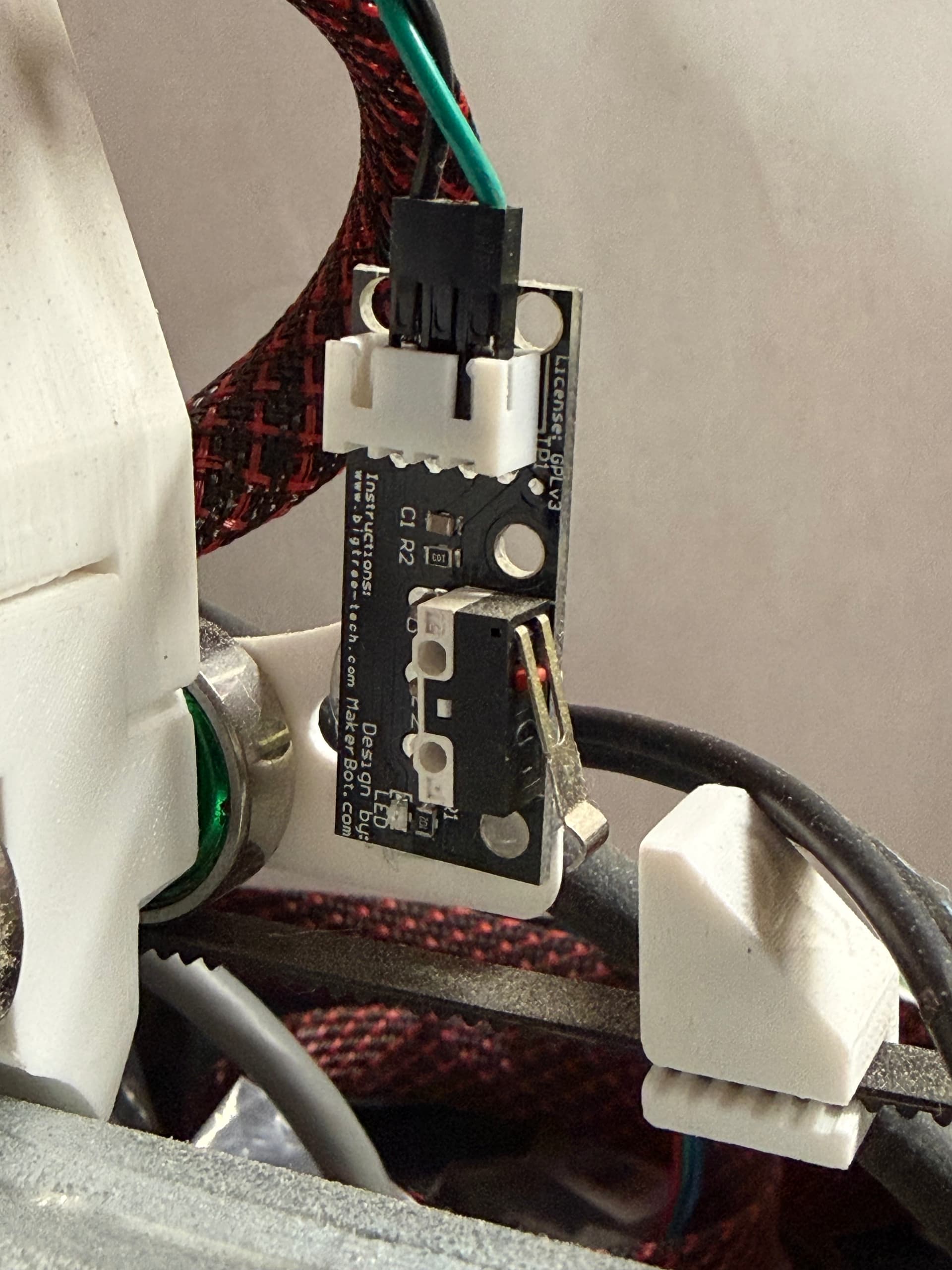 My Z axis homes “up” away from the cutting surface. I clipped the switch off the circuit board and mounted it to a 3D printed bolt cover sorry if the photo is blurry - space in there is very tight on the Burly model MPCNC and I tried to zoom in to show the switch. THere’s a big glob of hot glue around the wire connections to insulate them.