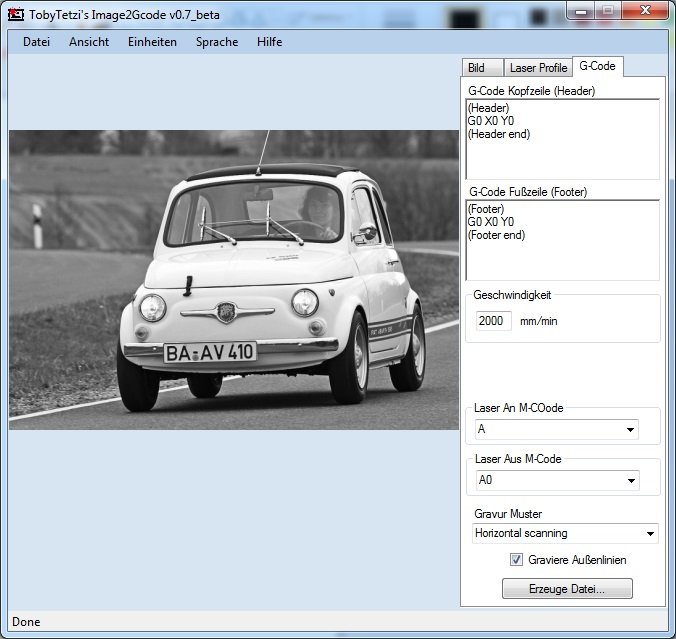 First i had an offset, when added it in front the image was inverted. When the commands are in front and after the laser command it solved the problem. I was able to convert a jpg file with the black and white scale (only that) to laser it.