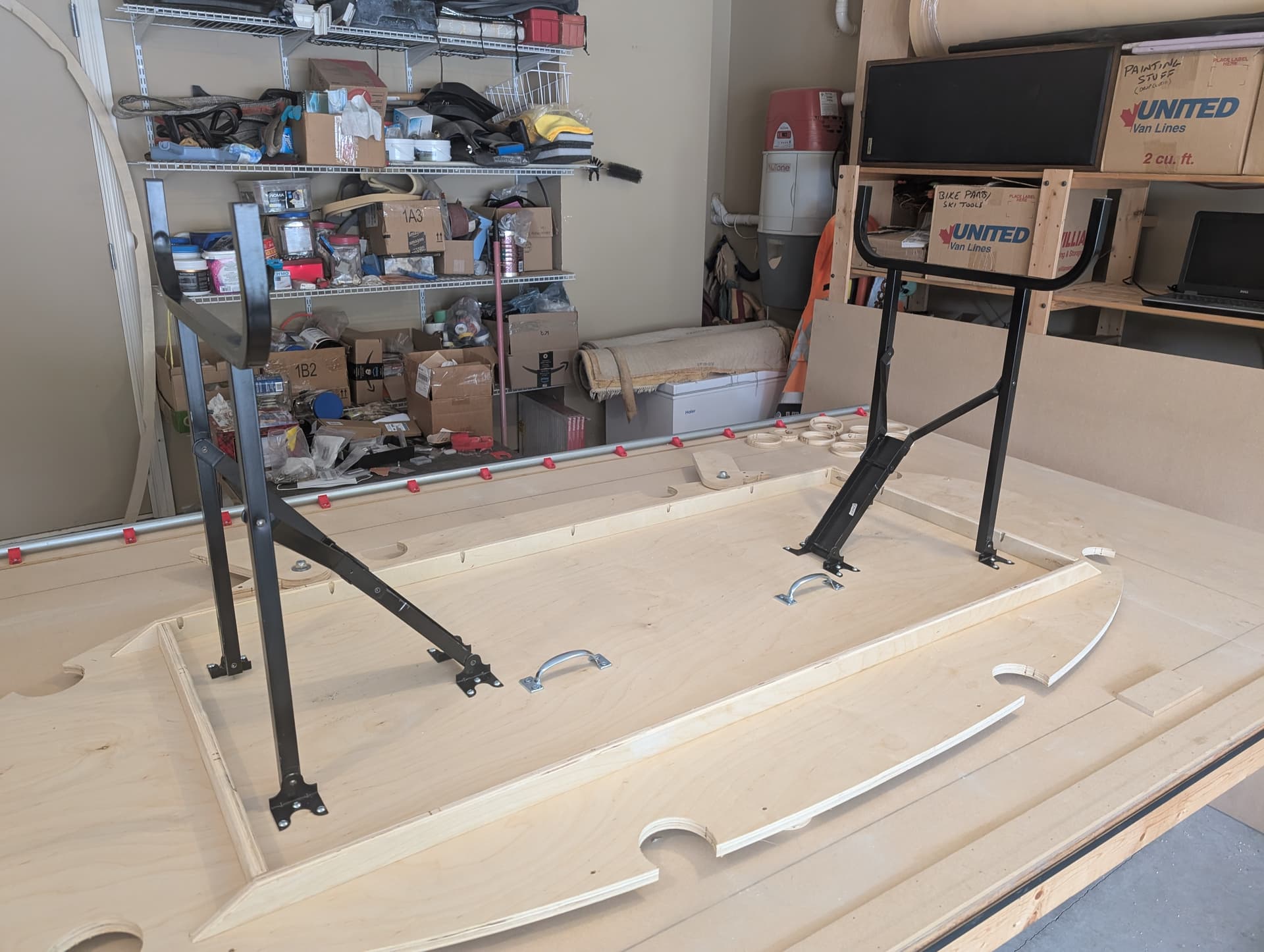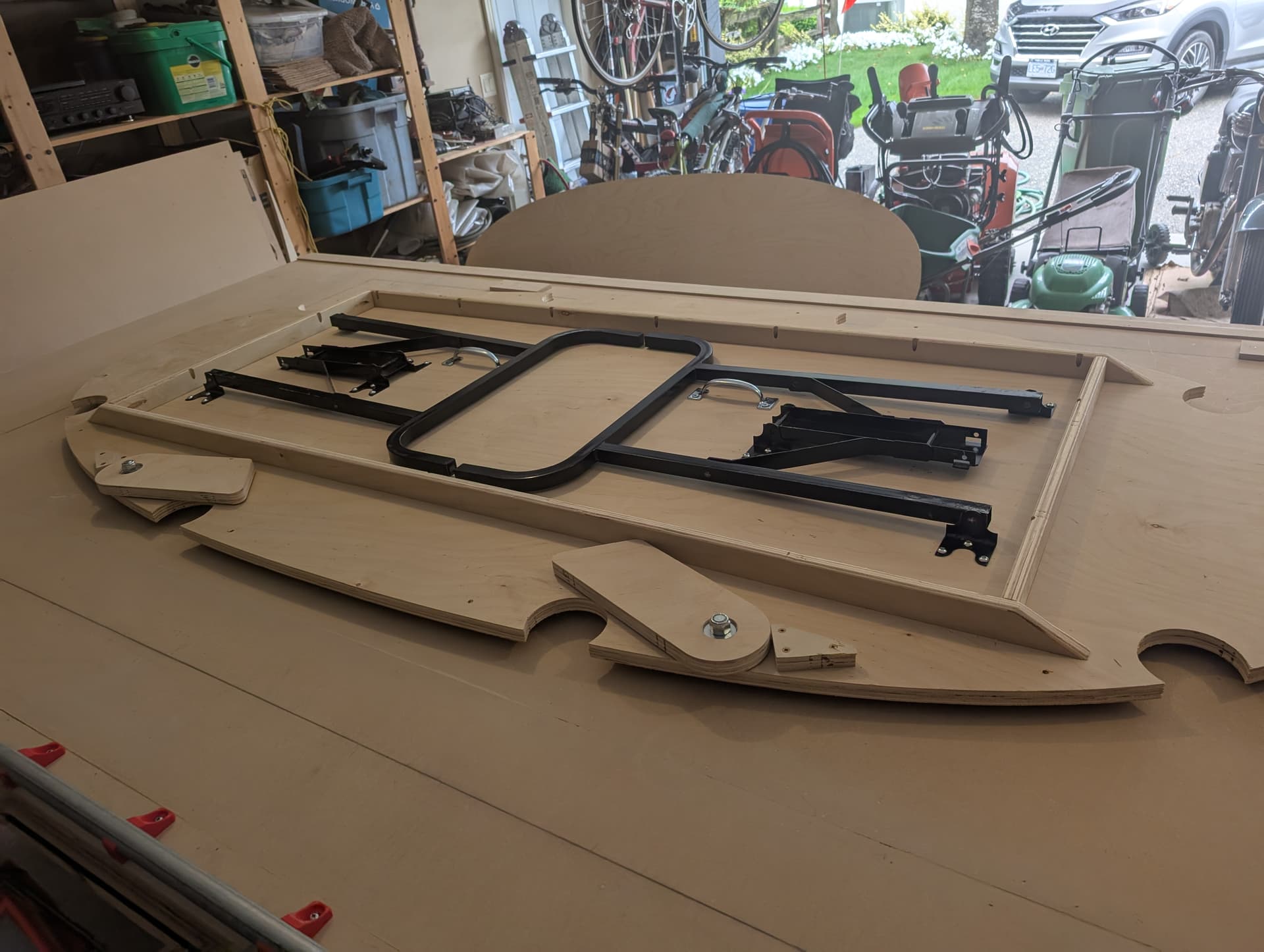 Here is the poker table with the support gussets, table legs, and “kickstands” installed