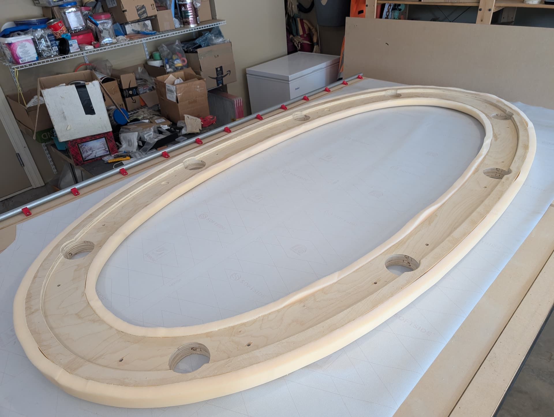I just need to do a quick sanding of the outer rail edge once the clamps are removed, and then I can install the foam, vinyl and felt.