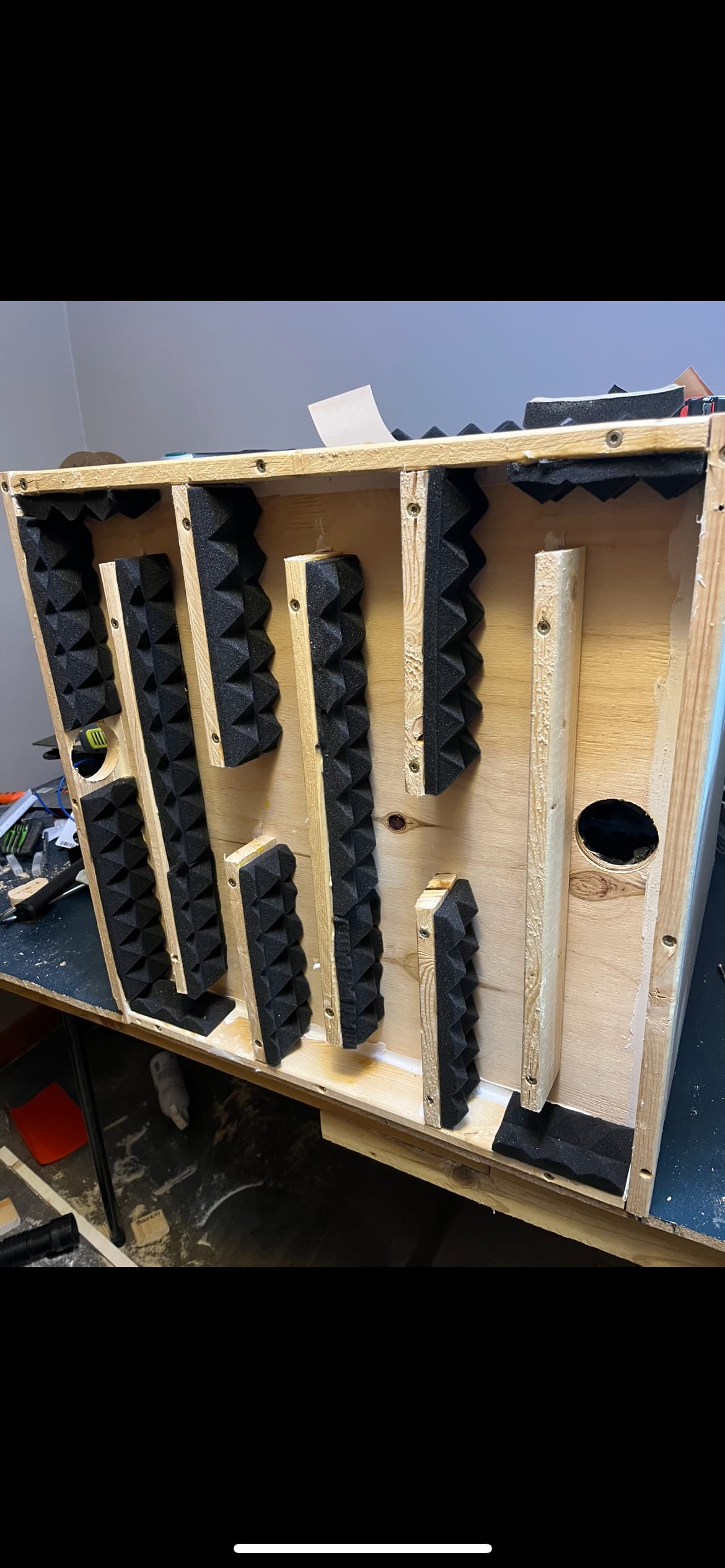 Has some casters so it rolls. And theres a hole where the exhausts goes through these baffles and then out into atmosphere. The baffles are now covered by a plywood sheet obviously.