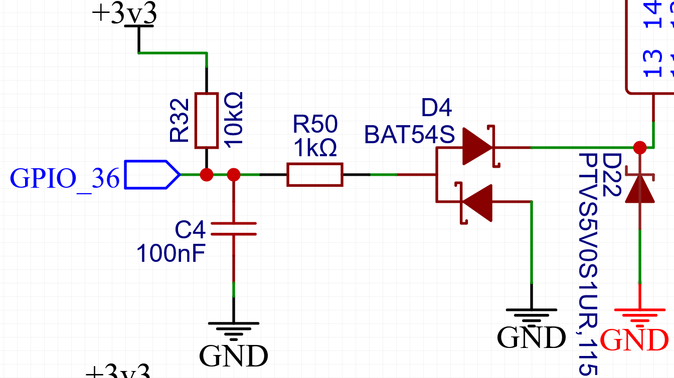 So anyway, Iâd be ok with just adding a decent sized 24V TVS like a 400W SMA part to that part of the circuit and calling it a day. If it were me Iâd probably swap the diode array for a single SOD-123 diode and up the voltage to 60-70V for a bit more voltage withstand. Iâd rearrange the circuit so it went Input connector â TVS cathode â single schottky diode â filter resistor â filter capacitor â pull up â ESP32 pin.
