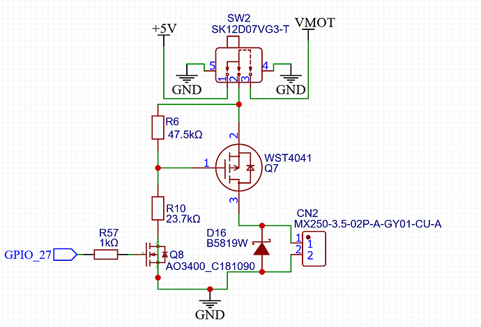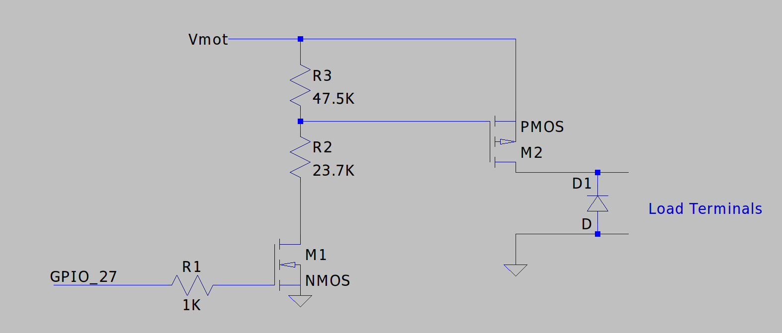Another would be trying to figure out a way to change the voltages applied to the gate. The easiest way to do that would probably be to put a zener diode in to clamp the voltage. Another way would be to change the resistors as needed using a jumper etc. You could also use some tricksiness and use PWM on GPIO_27 to apply say a 50% duty cycle to M1 when you know that it’s set to 24V input mode, but then you’ve got issues with breaking stuff if it goes wrong etc. etc.