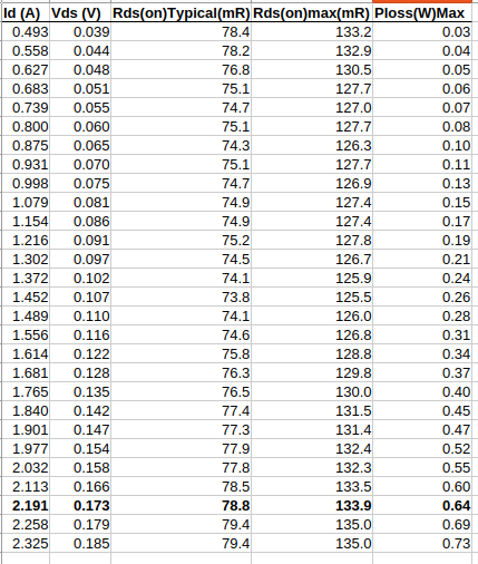 Considering the -3V Vgs situation: Same as above but with a bit less confidence in what the datasheet is saying because we’re on the ‘bad’ side of where the information ends. If we just stick to assuming it’ll be fine, that’s Vgs = -3V. We know we’ve got 0.64W to play with and we know that, from the previous calcs, that the Rds(on) will be 1.7x worse at temperature. This is a slightly annoying calculation to do because we don’t know the Rds(on), we have to calculate it from the graph and it relies on the current, which is also what we need to know to calculate the power. One way to do this is just guess-and-check until we get close. The better way would be to pull the Id vs Vds curve out using a plot digitizer and calculate that way. I’ll just do guess-and-check here. So if we say 2A, that appears to be about ~0.17V Vds. A ‘sketchy’ way to check that is to expand the graph on your screen as much as possible and then just use calipers or a ruler