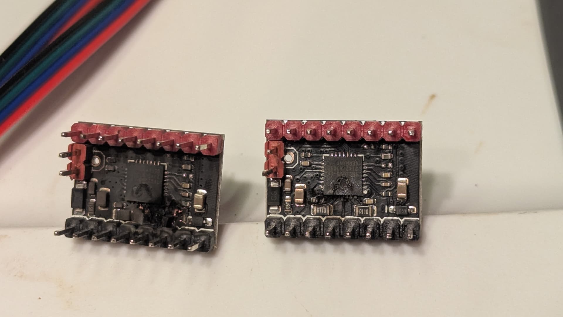 It first blew the extruder driver. I removed that and secured everything and then it blew the z driver, so clearly something is not happy The issue appears to be some of the early crimp connections made when putting in the test z brake board, but the 24v power supply has been struggling. Lacking the motivation and time currently to fix it, I just can’t not share the smoke evidence. Smh. #facepalm. I’ll video the next power in just for fun.