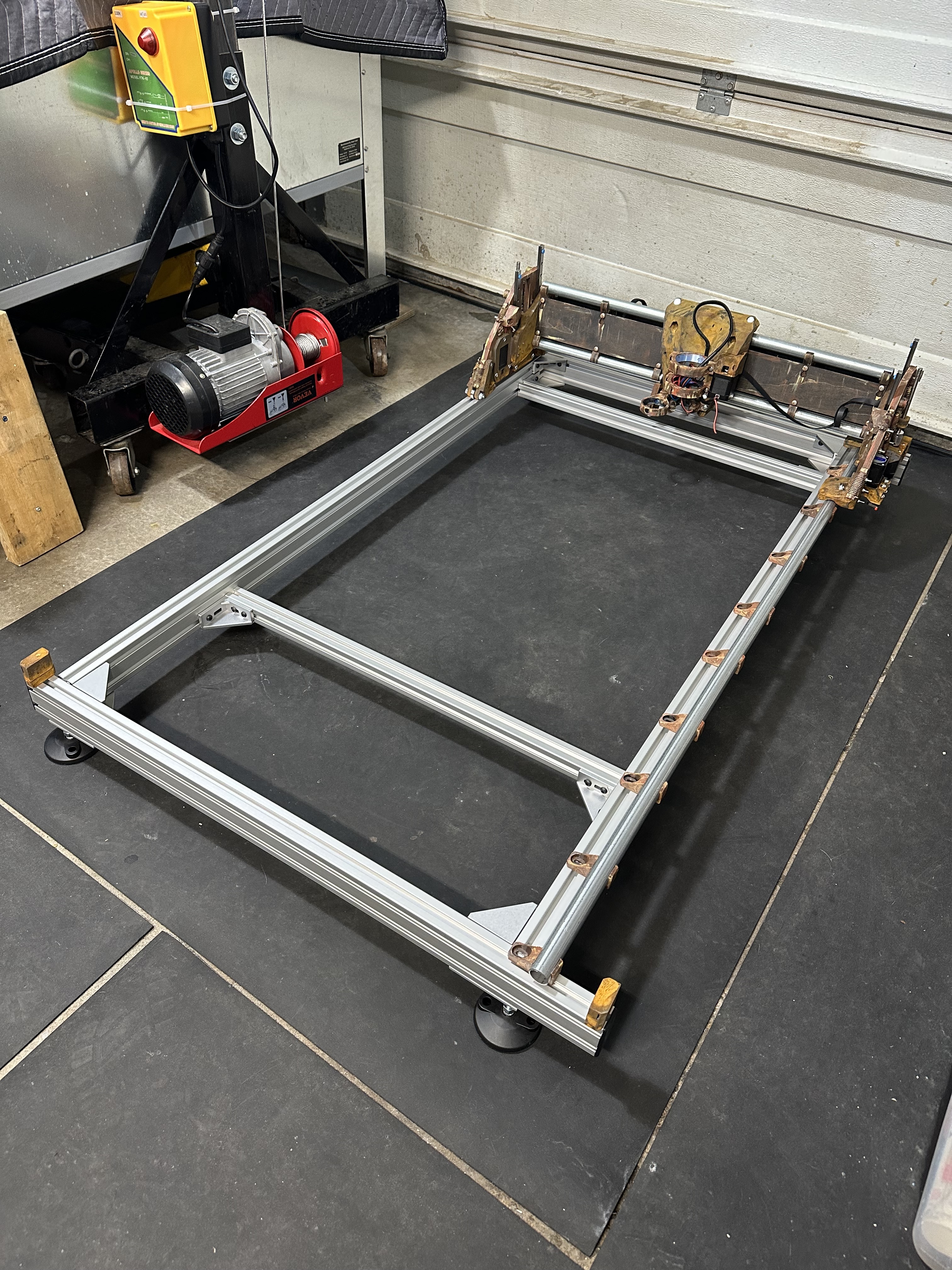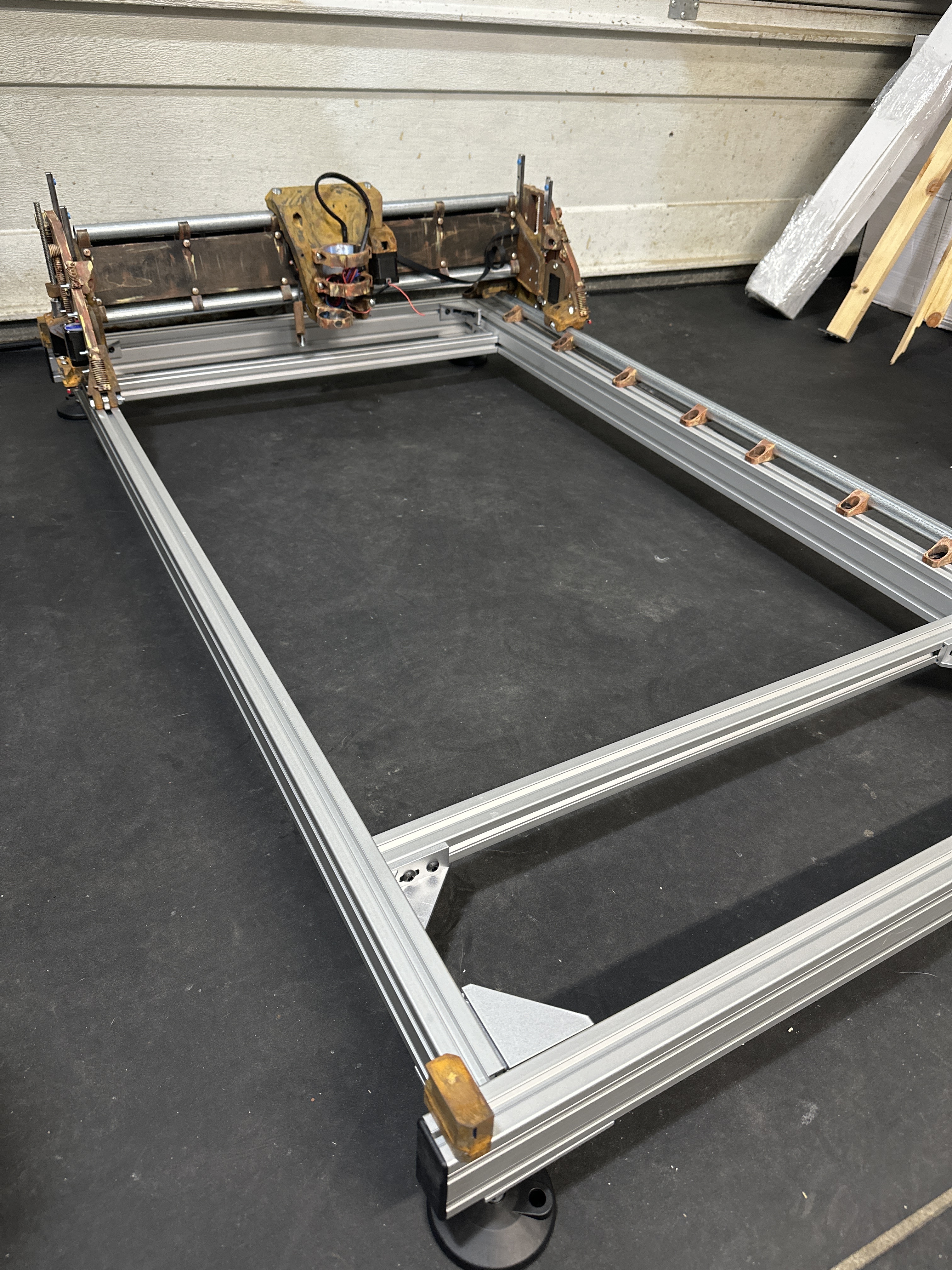 That floor mat it’s sitting on is 4’ x 6’. The end to end distance in the Y is 55". X is 29.5" from bearing to rail. The Y distance between the 3030 inner X rails is 40" - the block of ice will be “clamped” using the forward most rail so I’ll be able to put any length block in that I happen to need. I do believe I’m just going to cut some strips of gang nail and attach that to the inner surface of those two rails to bite the ice and keep the machine connected to the block of ice.