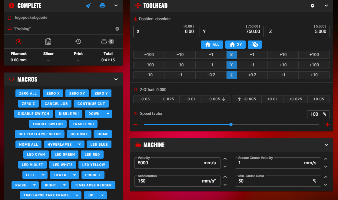 So with all the discussion on the pendant for the jackpot, I have managed to sort of make one for my klipper setup. Currently it is very difficult to use and clunky to get started, but from the pendant, I can run macros in klipper and potentially have it basically do anything a macro can do in klipper which is anything⌠but one thing at a time. I had a similar setup on my maslow with a wii remote and it worked awesome until the wii controller just died one day. Fast forward and I can pick them up off ebay for like $7 now, so lets just say there might be a few spares.
