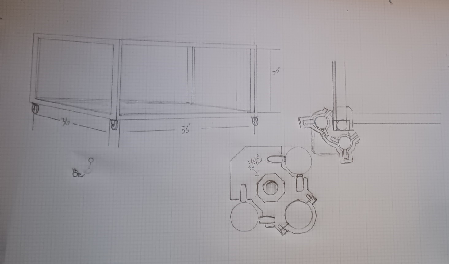 my idea after having slept on it, is to use 4 sets of the pieces that make up the z axis to place a lead screw on all four corners. these masts would be secured at the top and bottom so I’m going to have to do something clever to make sure they’re aligned. they would be attached by belts to a single stepper motor this would all have to fit inside the mentioned 56x36 with a max height of 30" for the final footprint.